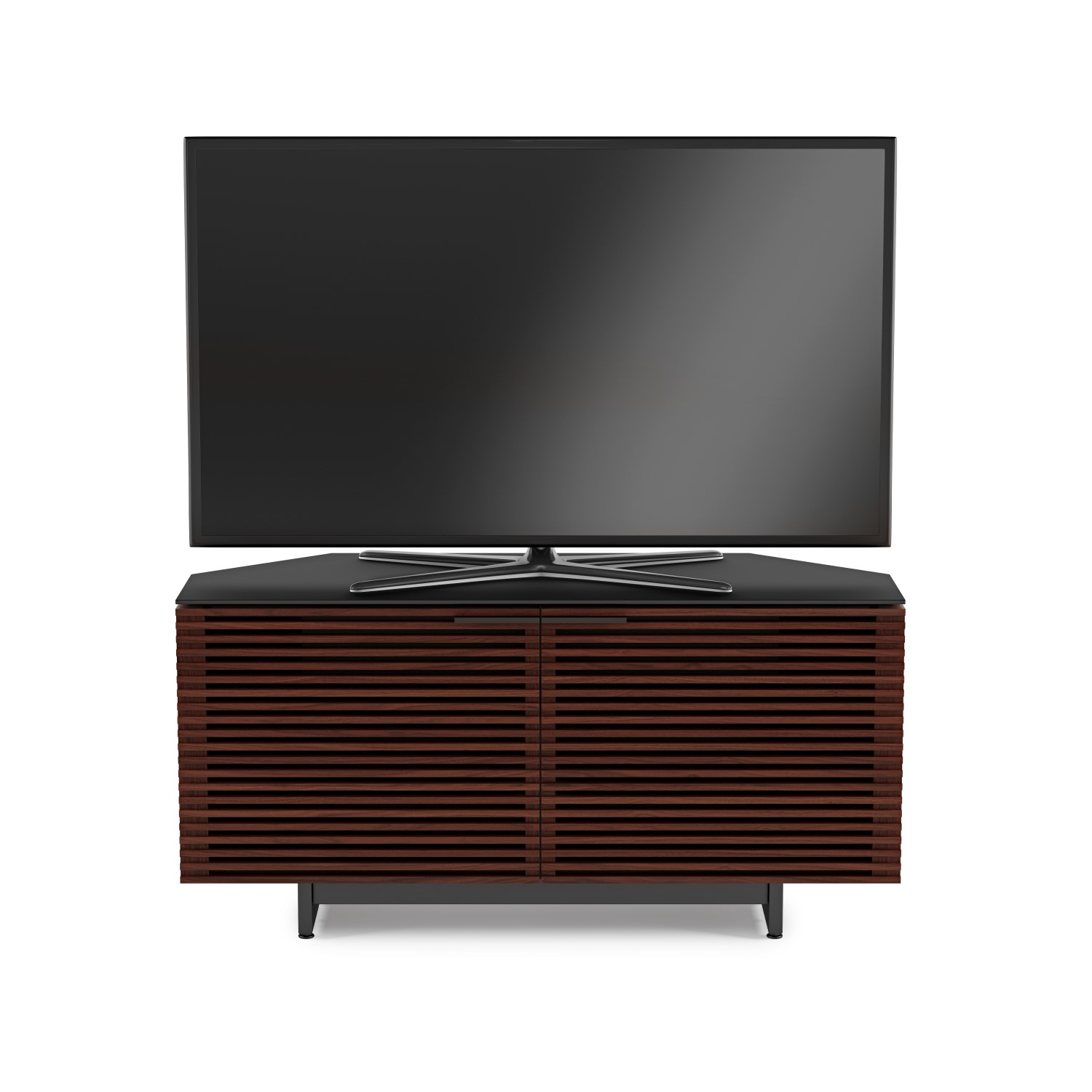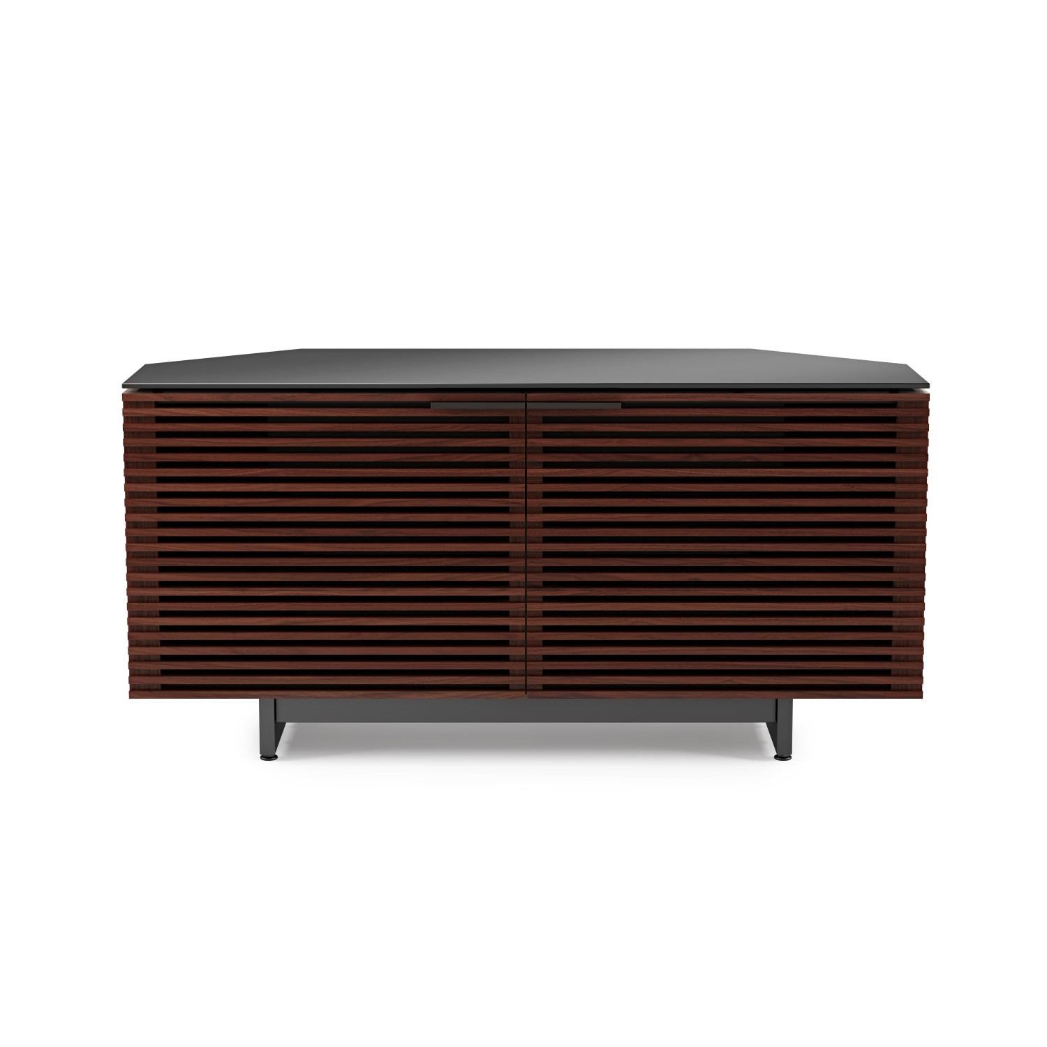 [0] => corridor corner media cabinet chocolate stained walnut 24.75hx50wx20d design: matthew weatherly