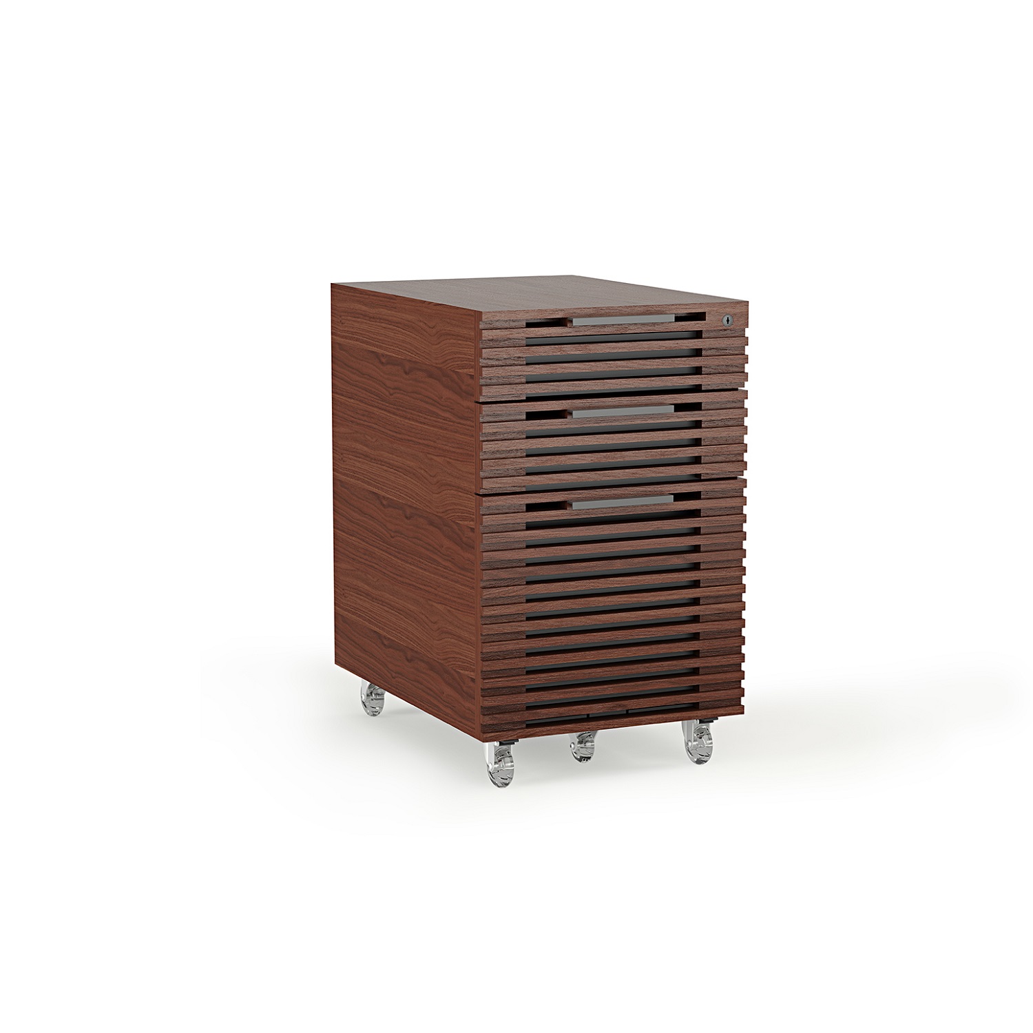 The Corridor Mobile File was designed with the modern professional in mind. Featuring chocolate walnut-stained wood, louvered drawer fronts, and locking wheels, Corridor's clean lines and refined styling is evident in every facet of its design. Two storage drawers and one file drawer provide extra storage space, while the lock keeps contents secure. The cabinet can also fit neatly underneath the Corridor Desk to keep supplies and files close at hand.