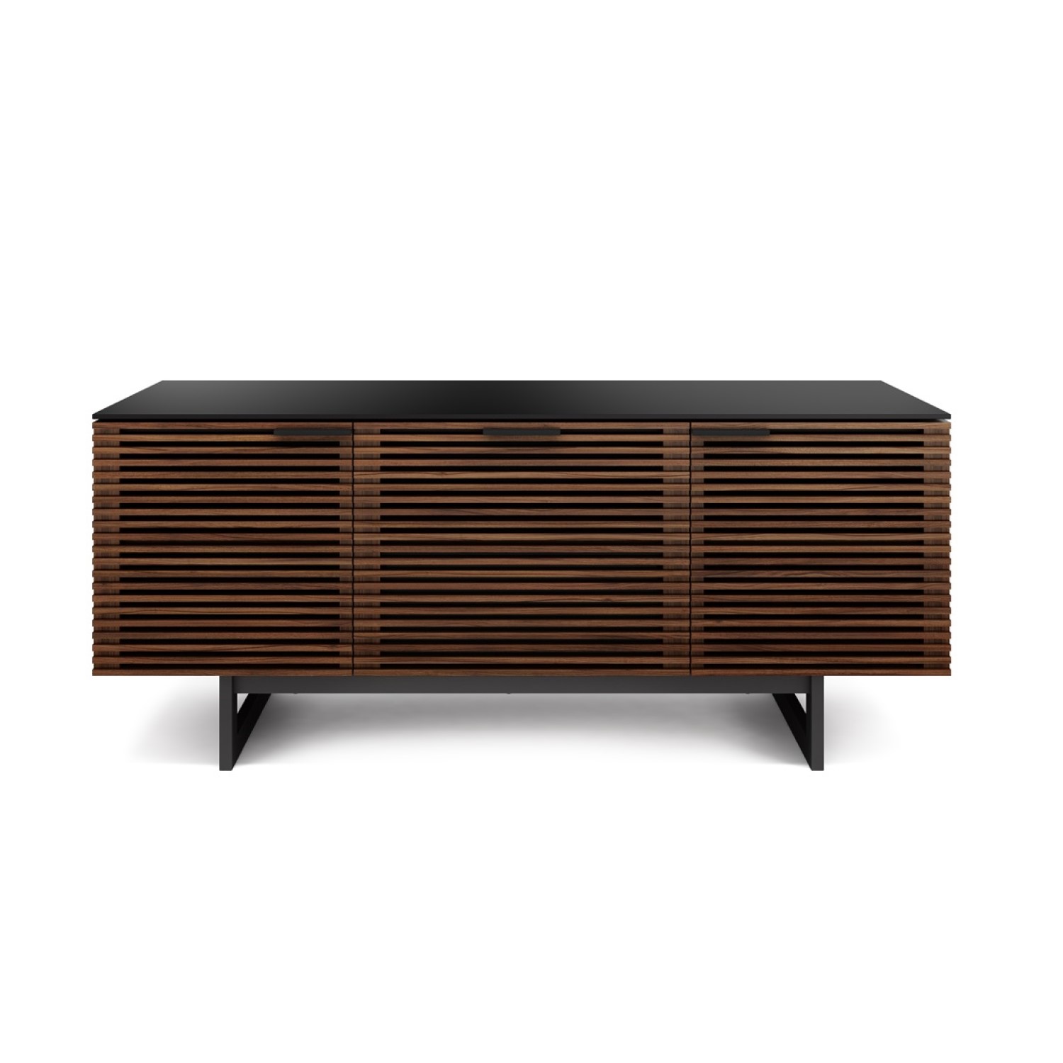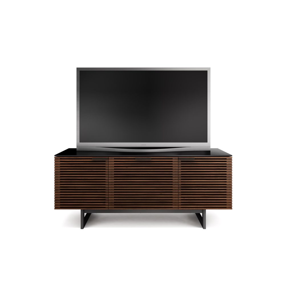 The Corridor Three Door TV Cabinet by BDI, available in chocolate-stained walnut, is a contemporary media unit that forms part of the Corridor home collection. Combining high functionality with premium design, the cabinet features louvered doors, durable satin-etched tempered glass, a center drawer, a full-width soundbar shelf, and ample storage for movies, video games, and other media. Versatile and adaptable, the Corridor Three Door TV Cabinet will maximize storage space while adding style to any room.