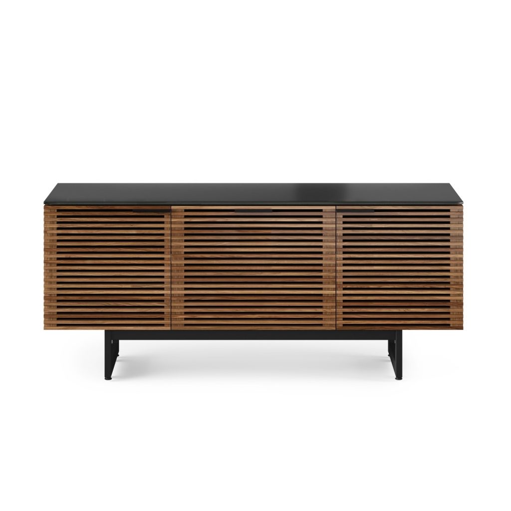 The Corridor Three Door TV Cabinet by BDI, available in natural walnut, is a contemporary media unit that forms part of the Corridor home collection. Combining high functionality with premium design, the cabinet features louvered doors, durable satin-etched tempered glass, a center drawer, a full-width soundbar shelf, and ample storage for movies, video games, and other media. Versatile and adaptable, the Corridor Three Door TV Cabinet will maximize storage space while adding style to any room.