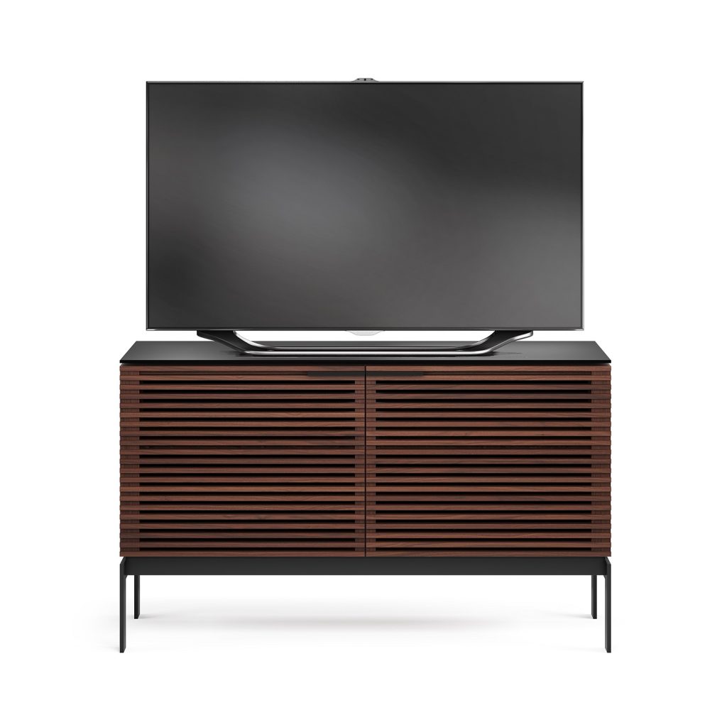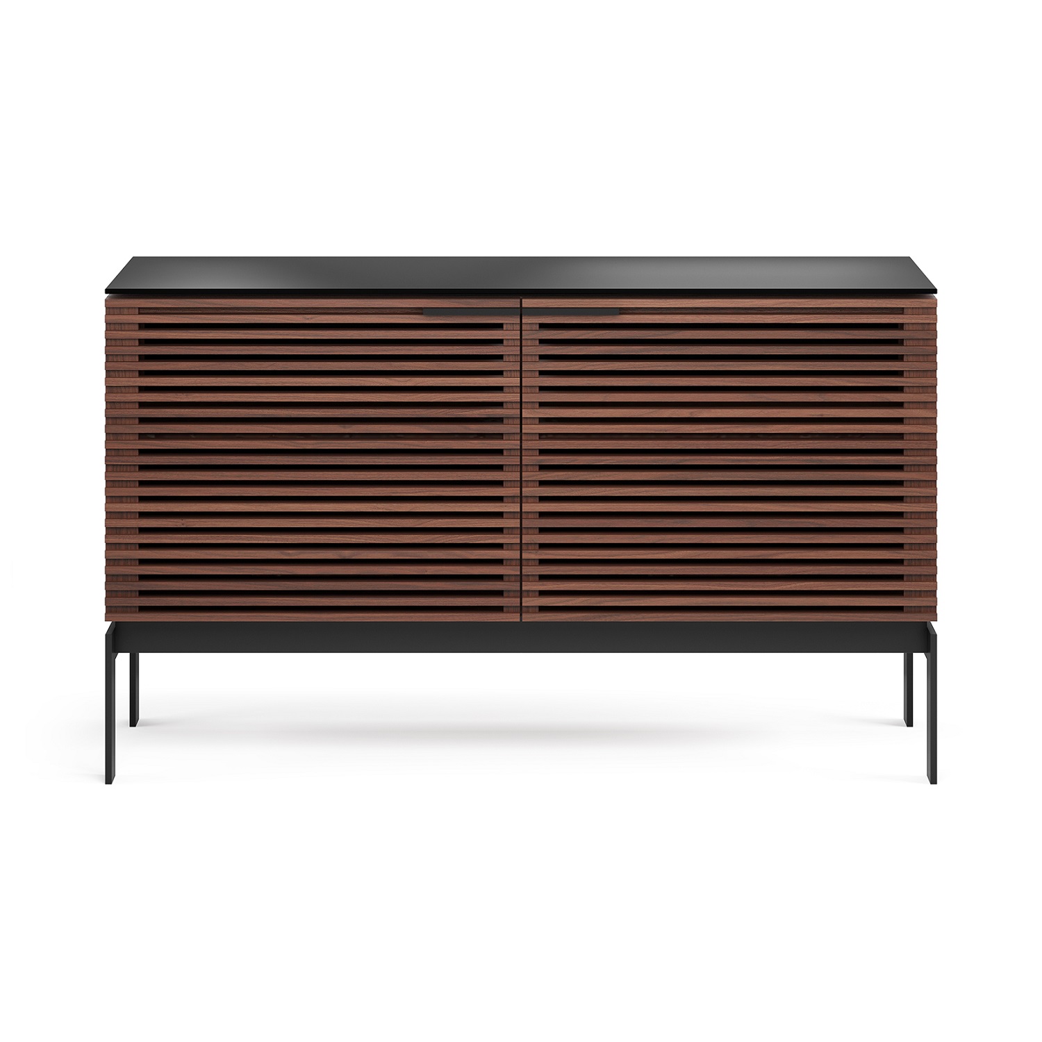 The Corridor Two-Door Credenza by BDI is a contemporary media cabinet that forms part of the Corridor home collection. Perfect for streaming devices, gaming consoles, and up to a 60" television, the credenza features louvered doors that allow remote control access and also contains a soundbar shelf. These technology-friendly features ensure ventilated storage and optimal positioning for your sound system and media setup. The durable satin-etched tempered glass top complements the chocolate-stained walnut wood, and the credenza's slim design makes it ideal for small spaces, whether it's used as either a storage credenza or a compact media center.