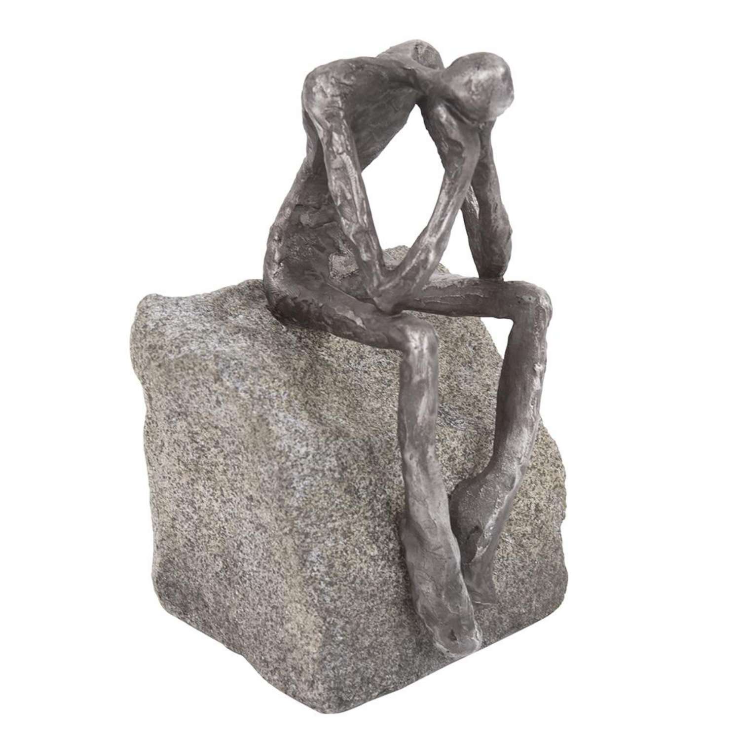 [0] => The Deep Thought Figure is a minimalist yet compelling sculpture, featuring a simplified human form sitting on a boulder in a contemplative pose. Made of polyresin, the figure has a silver finish with black accents, and the boulder has a faux stone finish with a hammered texture and flat bottom that lets it stand on the flat surface of your choosing. The smaller size of the Deep Thought Figure allows it to be displayed in a variety of spaces, or to be used as a paperweight or bookend.