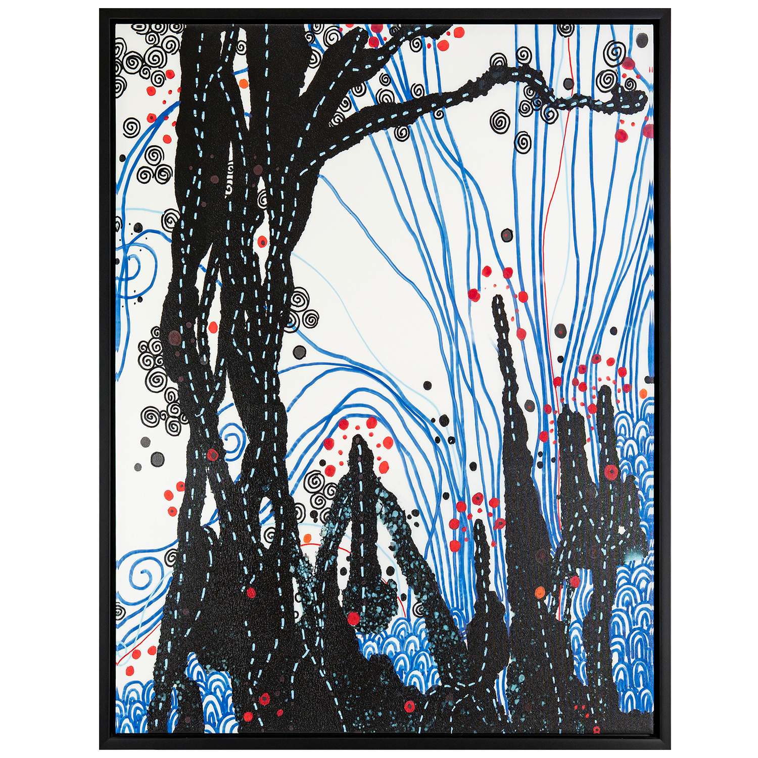 [0] => The Deep Within I Wall Art brings bold abstraction and a touch of quirkiness to your interior. Thick black lines reminiscent of trees and plants dominate the left and bottom of the canvas, with thinner blue lines on the right creating contrast. Red dots and spiral motifs draw the eye around the composition and add a playful feel. Deep Within I is available with a black frame and hand-painted gel texture, bringing gallery-quality art to your home.