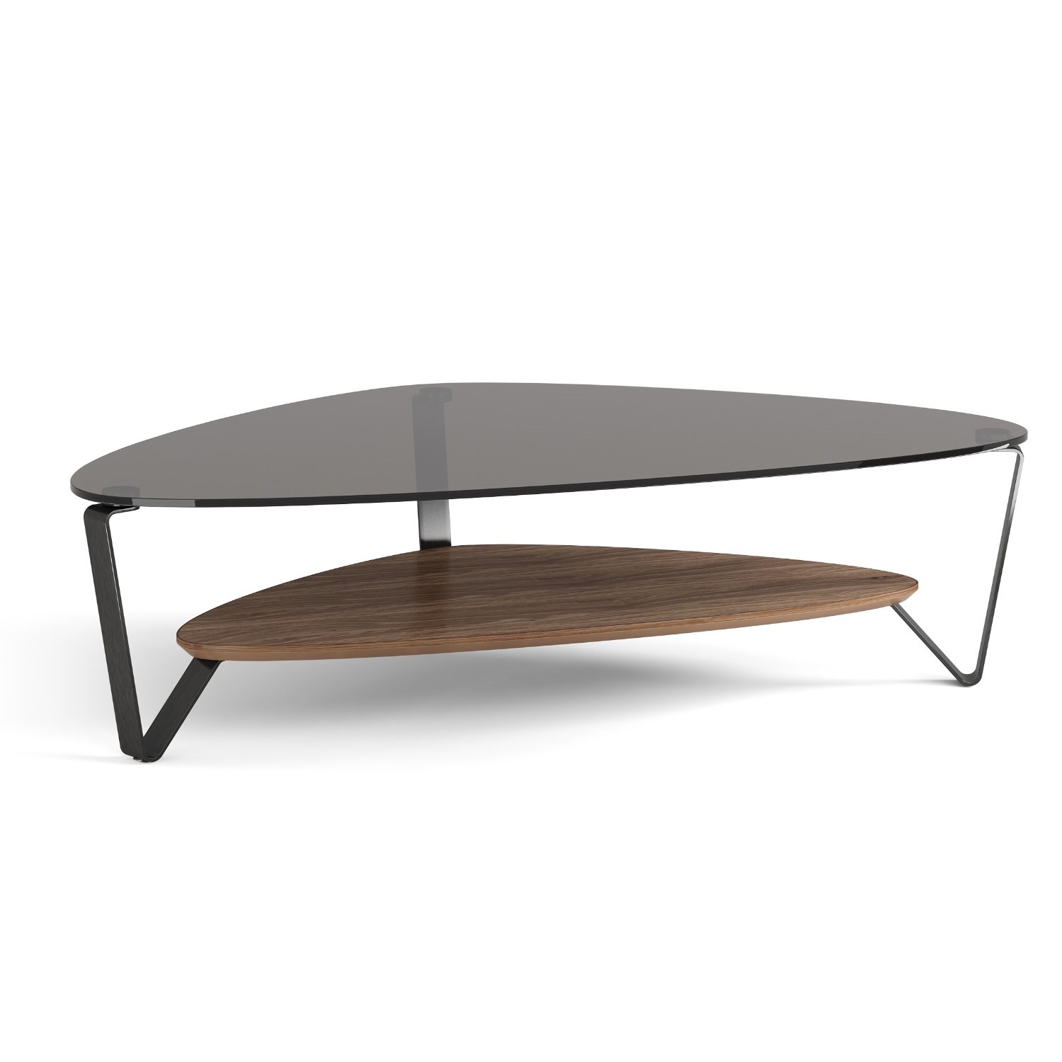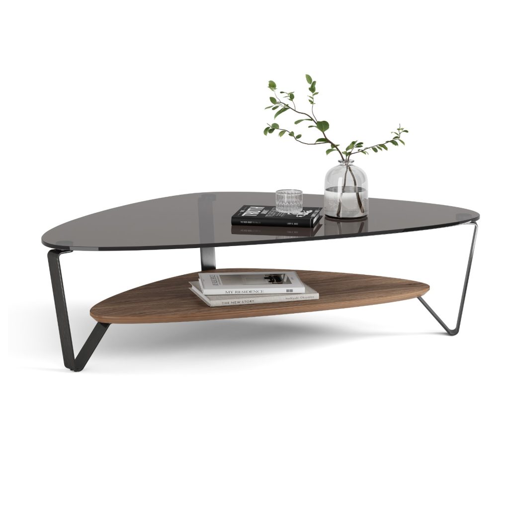 Designed by Louis A. Lara, the Dino Large Coffee Table has a soft, triangular shape that makes it versatile for a range of settings -- and ideal paired with a sectional sofa. Dino features a polished, grey-tinted tempered glass top and a beveled lower shelf made of hardwood with a natural walnut veneer. Three brushed carbon legs with a black finish provide stable support for this sleek and modern coffee table.