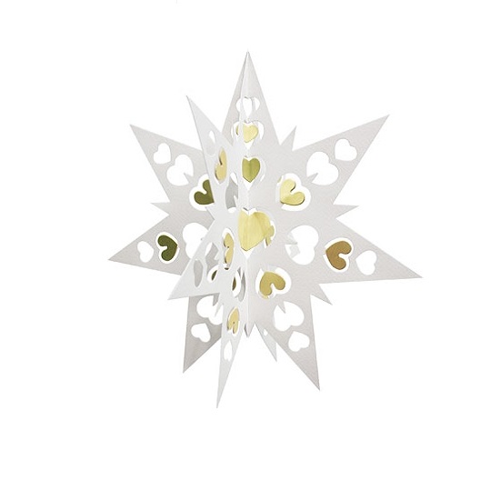 [0] => The Double Star Large paper holiday decoration, designed by Anni and Bent Knudsen, features an intricate design based on traditional Danish decorations. Repeating heart-shaped cutouts are accented by golden heart accents, for a piece that is sure to bring festive holiday charm to your home.