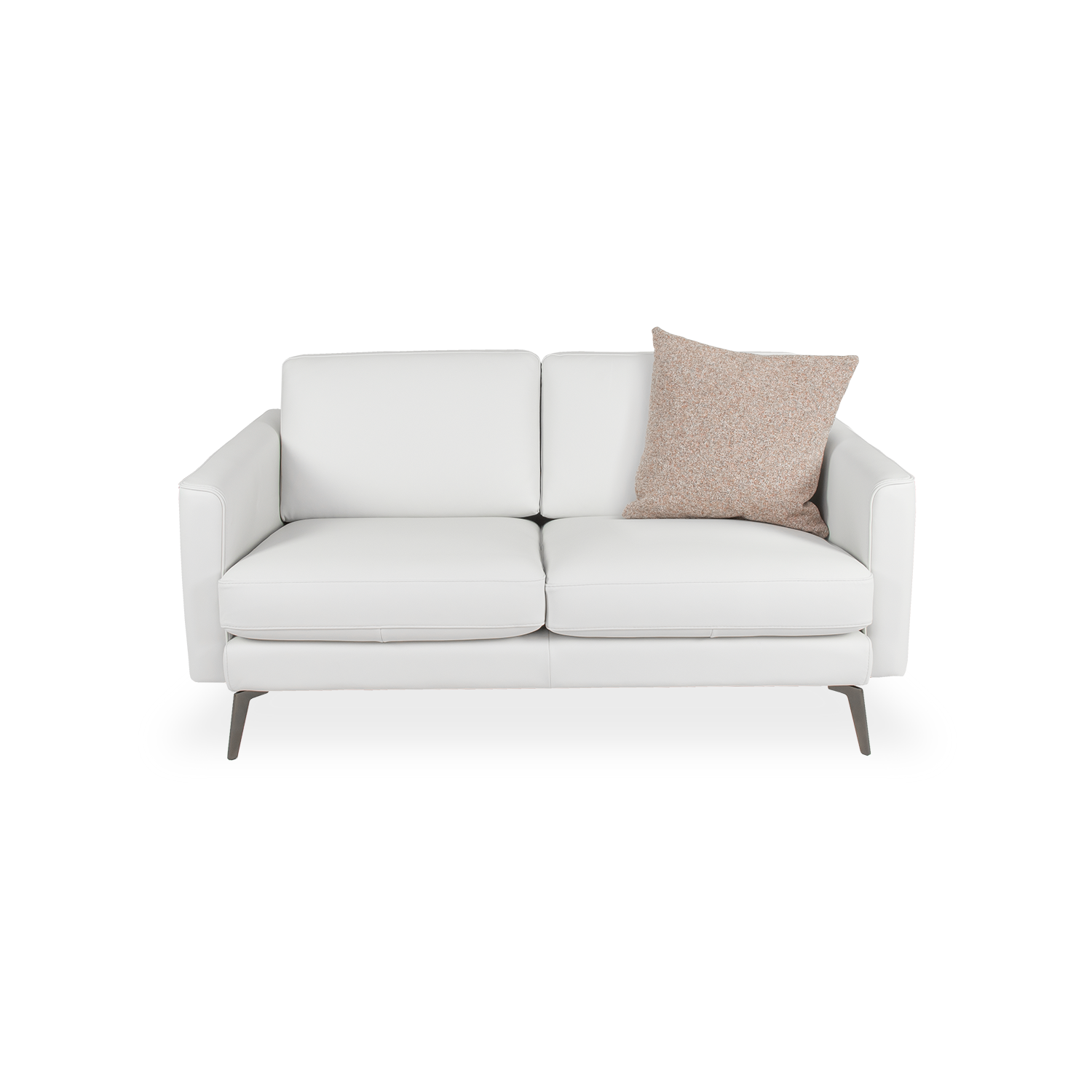 [0] => The Drake Loveseat, available in white Biotite leather with brushed metal feet, features two large seat cushions and rounded edges for comfort and style. The smoothness of the leather is brought out by the detailed matched stitching, which creates an elegant design that conforms to the body comfortably.