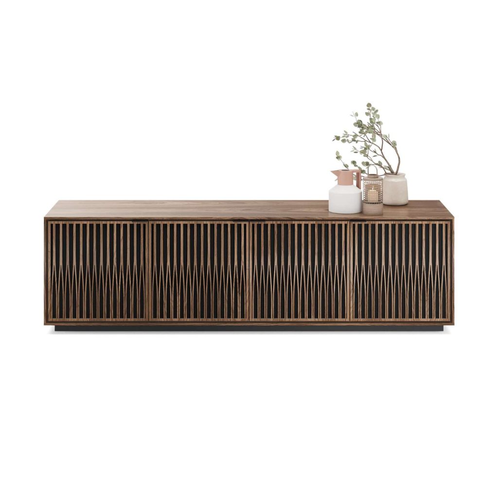 Part of the award-winning collection by BDI, the Elements Media Cabinet is a versatile design usable as a media console, dining buffet, or storage sideboard. Its low-profile, modern structure features a Rolling Plinth base to allow for smooth movement and easy storage access, while its adjustable soft-close doors are crafted with precision laser carving and feature BDI's unique Tune pattern -- designed to echo the rhythm of sound waves. Backed with a mesh and fabric liner, the design of the doors provides acoustic transparency, ventilation, and remote access. This cabinet's interior is just as thoughtfully engineered, with adjustable glass shelves, wire management, removable back panels, and a TV safety strap. With a timeless natural walnut finish and powder-coated steel base, Elements creates a harmonious blend of sophistication and practicality.