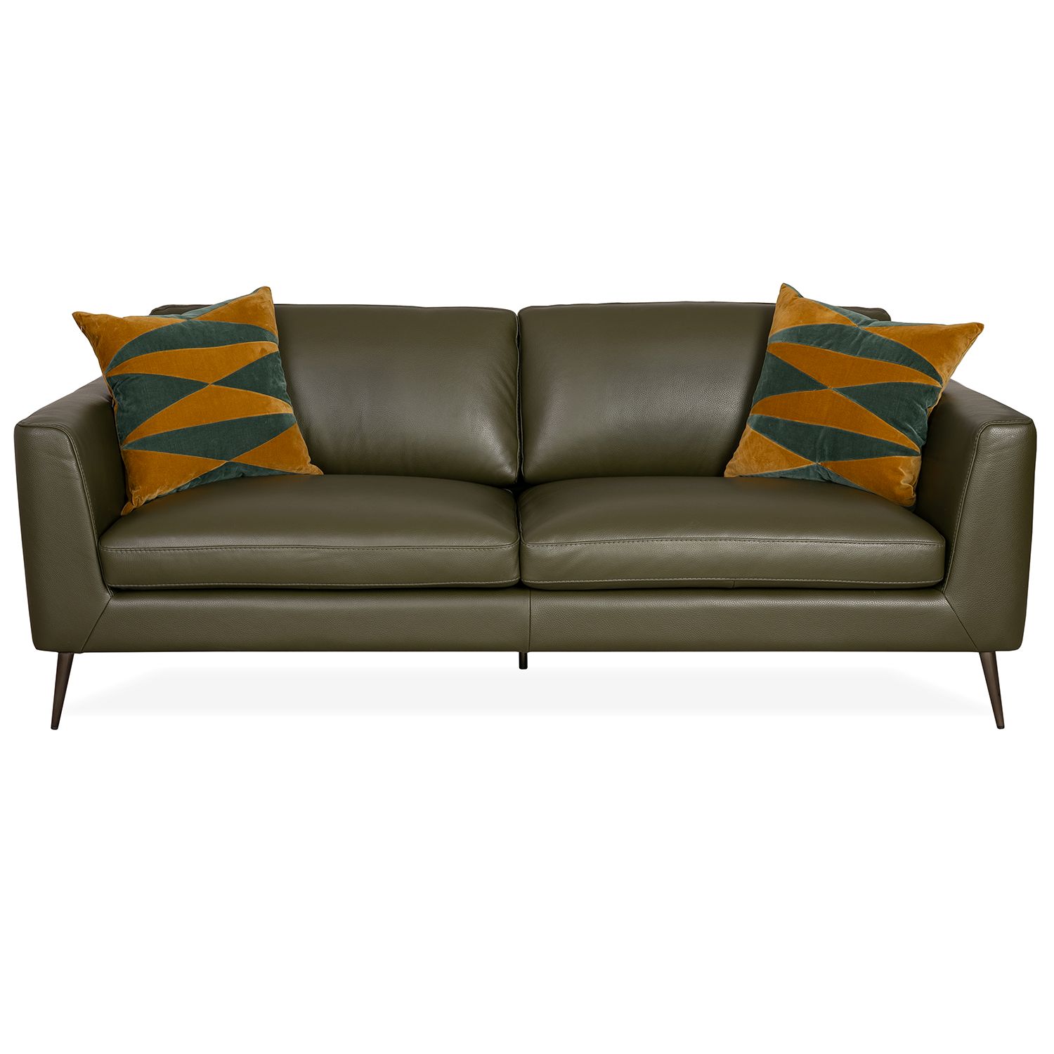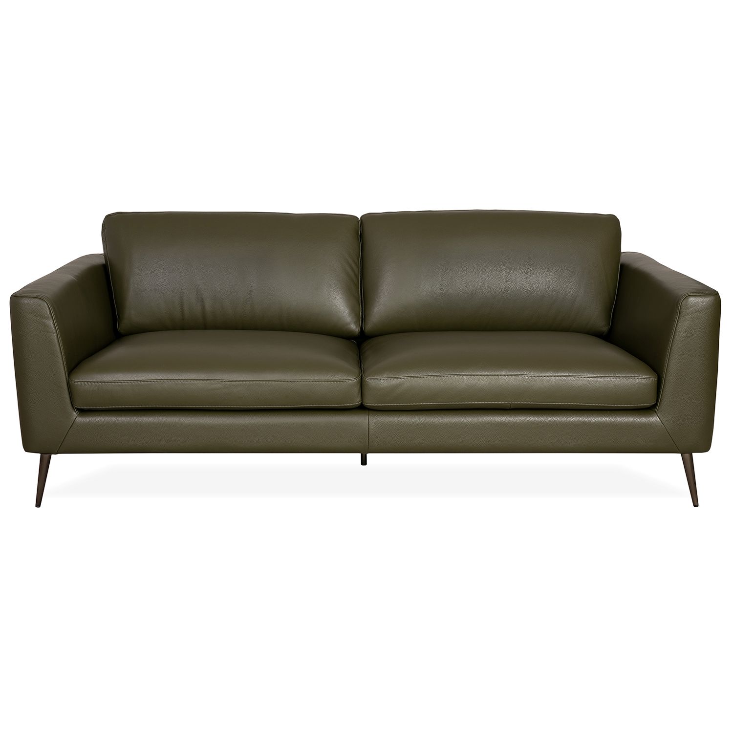 Made in Italy, the Emilio Sofa has a clean, contemporary look with wide seats and subtly angled armrests. Emilio's dark olive green leather has a smooth feel heightened by detailed matching stitching, with vertical seams down the sides providing an elegant accent. The supportive back cushions can be attached to the sofa via discreet zippers or left unattached depending on your comfort preference. Slim metal legs taper outward toward the ground and feature a smoked finish that can appear grey or bronze in different lights, adding unique depth. Emilio's classic, understated design and striking color will add flair to a variety of design environments.