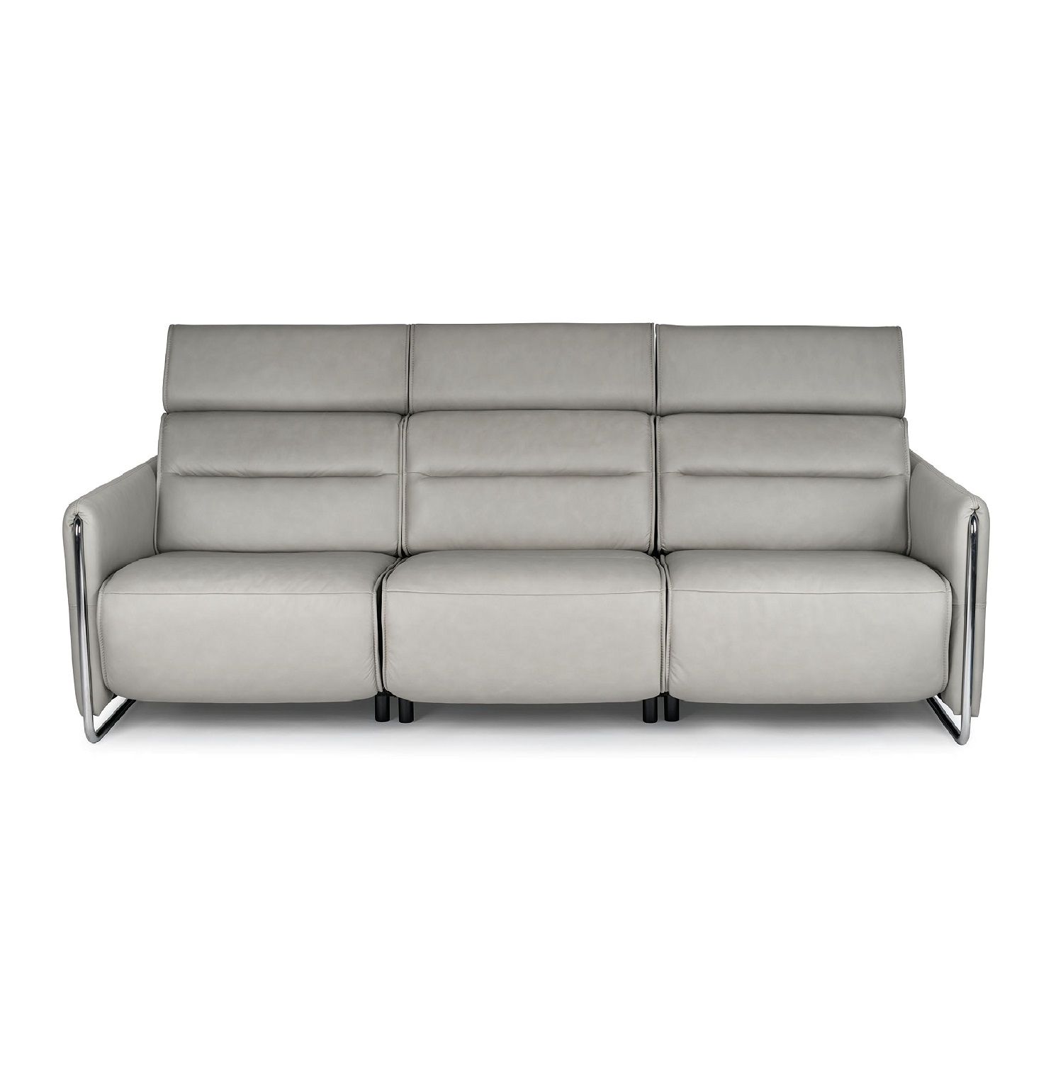The Emily Power Sofa features chrome trim and legs, and Paloma silver grey leather upholstery. The deep, wide seats provide ample comfort, and the thin, curved arms add a minimalist touch. Matching stiching creates a tailored look, while the metal legs create a square framework within the fabric. Power controls are discretely located inside the right arm.