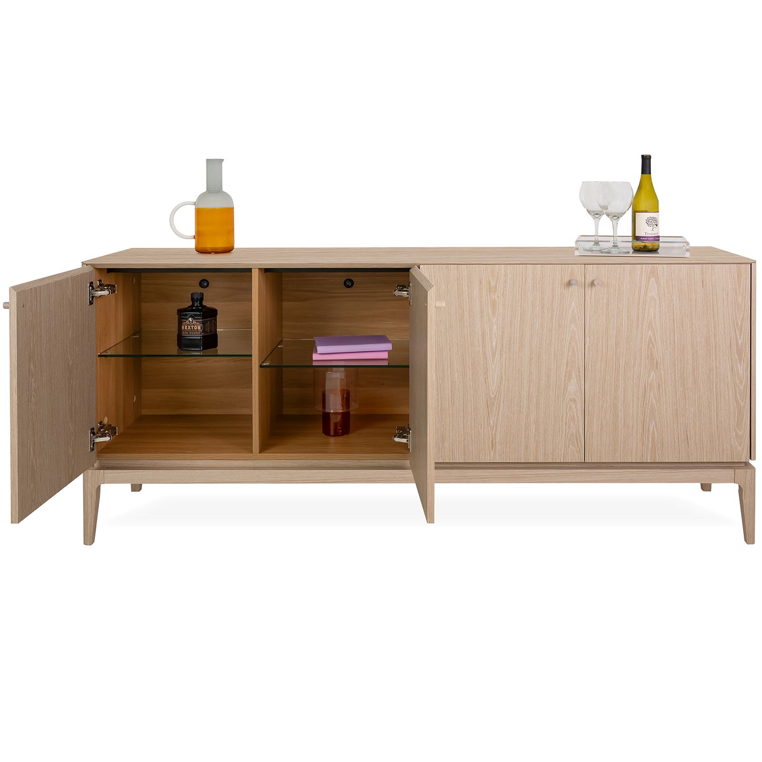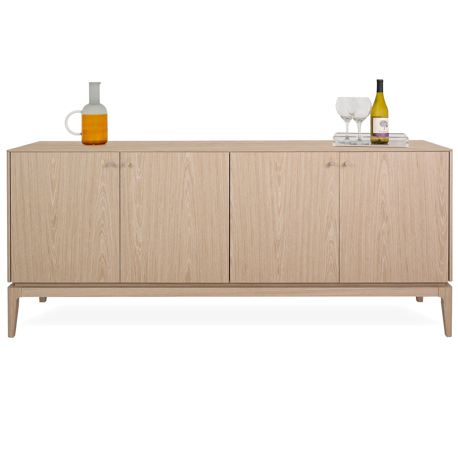 The Everett Buffet, available with a light oak veneer, seamlessly unifies clean lines into a balanced modern design. The rounded edges of the top and the slim tapering of the legs are enhanced by the elegant wood grain and simple door handles. A cutout above the base creates a neat, layered look that adds a slight edge to an otherwise classic design. Four cabinets conceal interior glass shelves which provide ample storage space for your dining essentials.