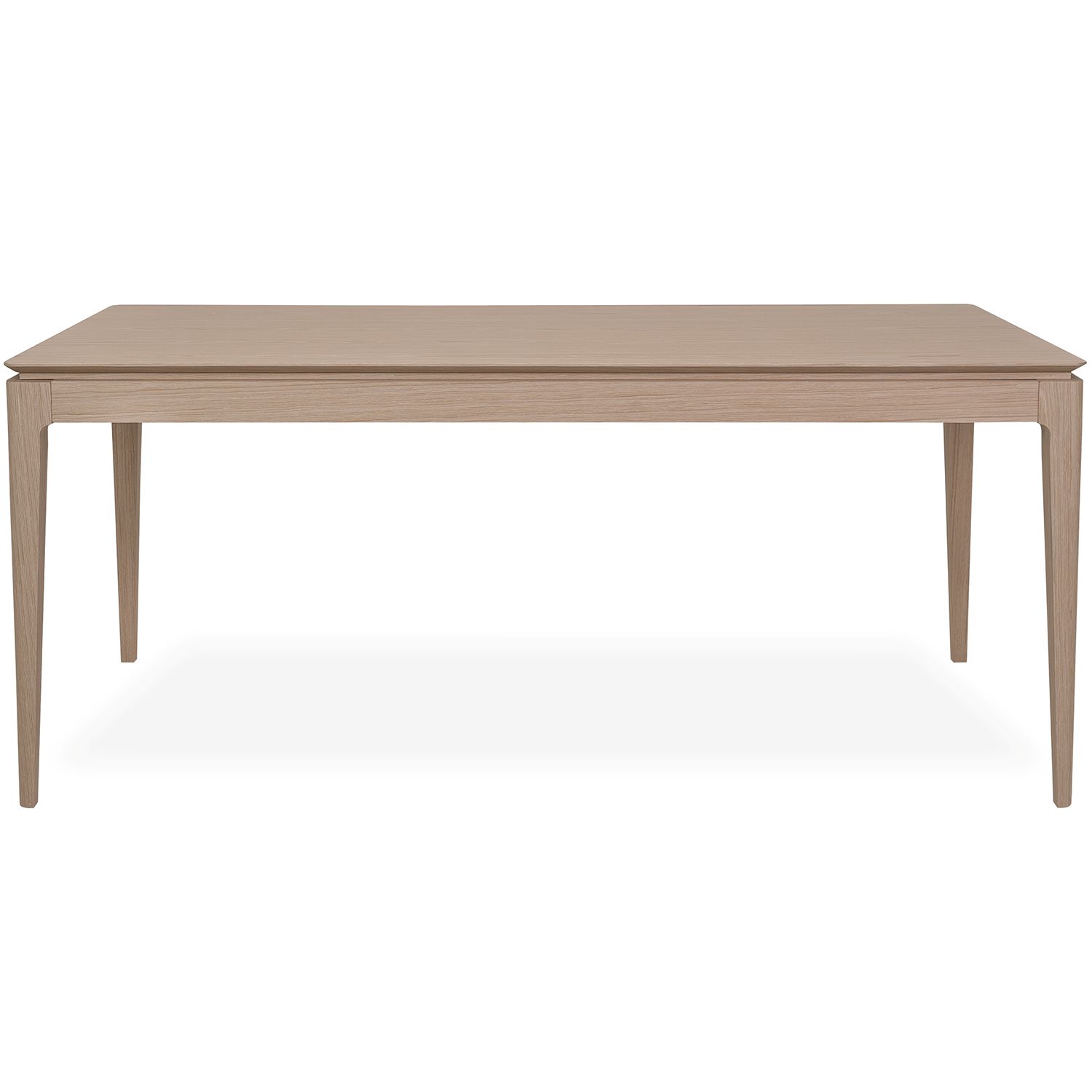 The Everett Dining Table, available with a light oak veneer, seamlessly unifies clean lines into a balanced modern design. The rounded edges of the tabletop contrast attractively with the gradual tapering of the legs. A cutout between the tabletop and base creates a neat, layered look that adds a slight edge to an otherwise classic design.