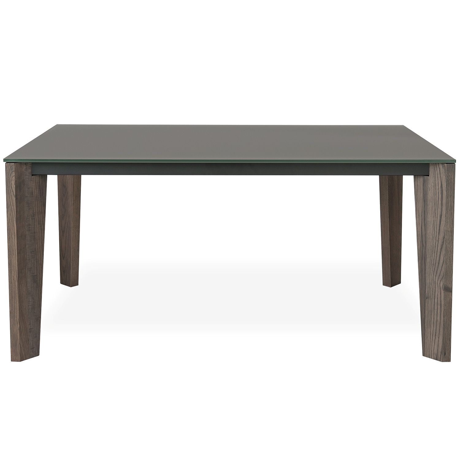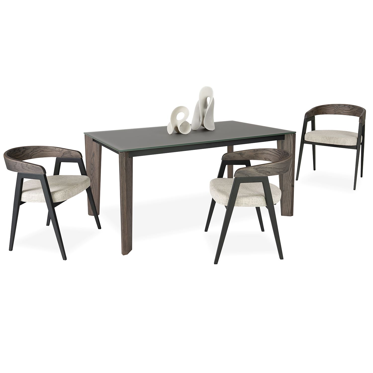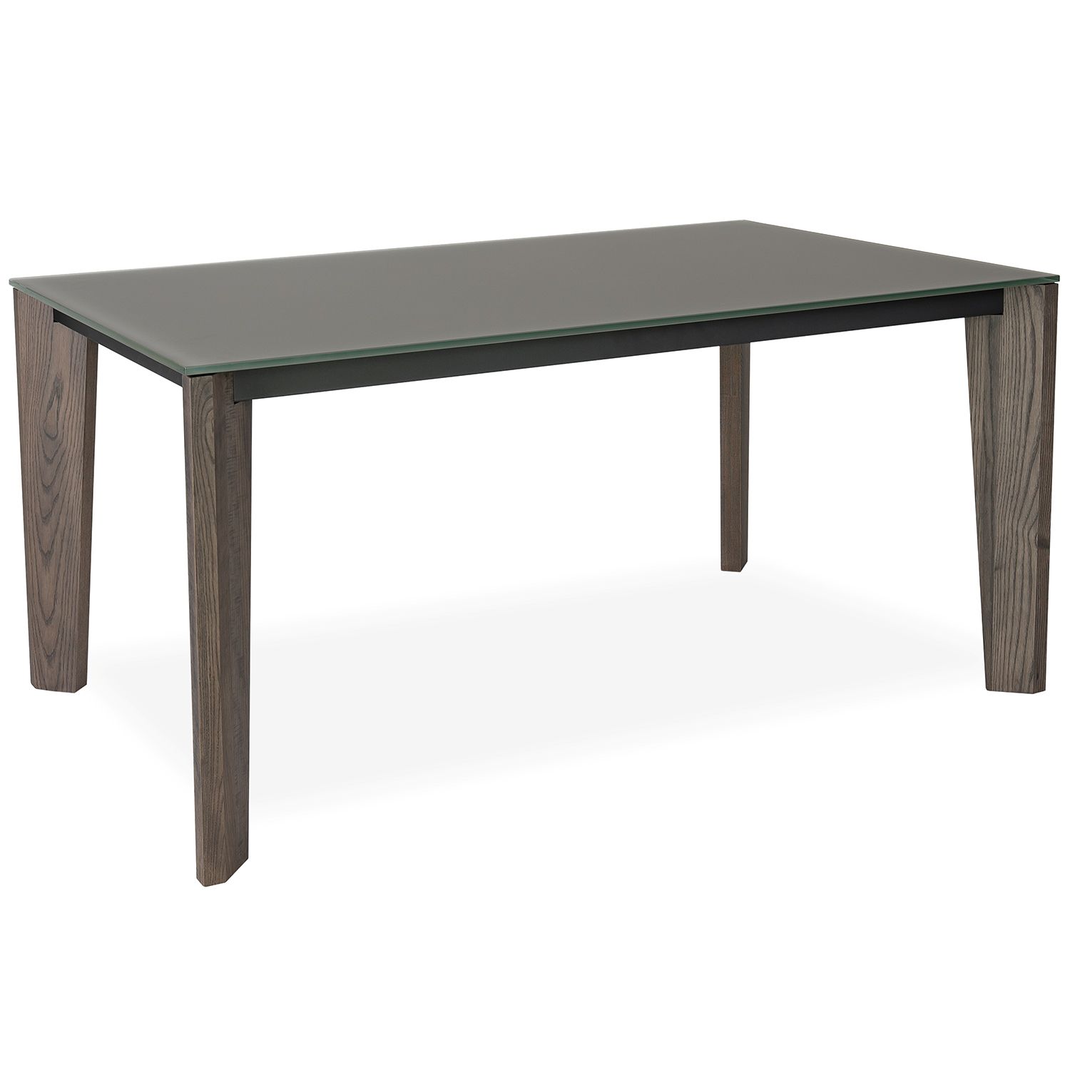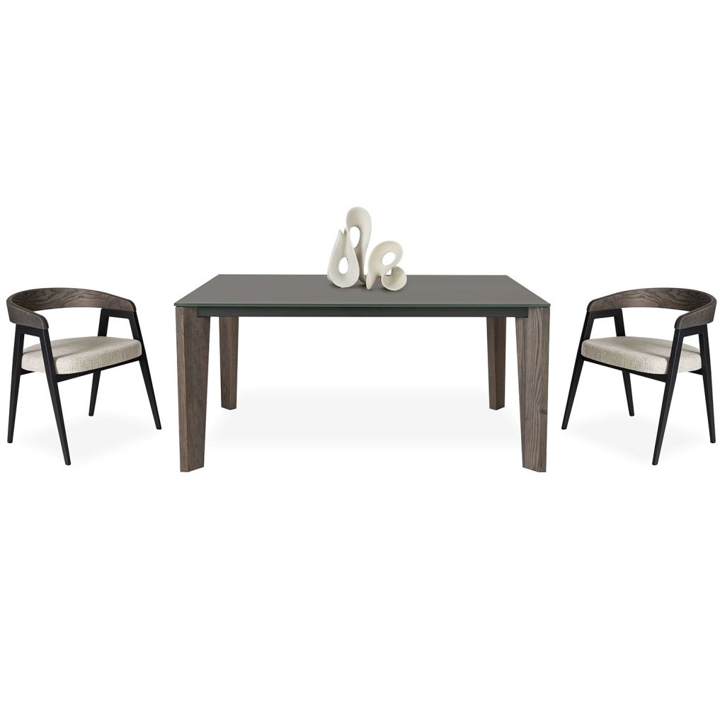 The Fabiola Table unites neutral tones and sleek lines to bring modern refinement to your dining room. Fabiola's glass tabletop in matte taupe complements the angled legs in raccoon brown, made from responsibly harvested ash wood. The structure is held together by a black steel frame that is fully welded and finished with a scratch-resistant powder coating for high durability.
