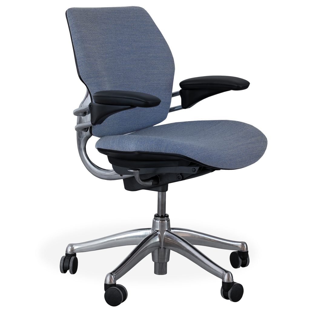 Both functional and stylish, the Freedom Task Chair has light denim blue fabric upholstery made of wool and nylon, complemented by an aluminum frame with graphite trim and long-lasting multi-layer Duron armrests. Freedom's manufacturer is committed to sustainability, with the goal to not only minimize carbon footprint but also create a positive impact on the environment.