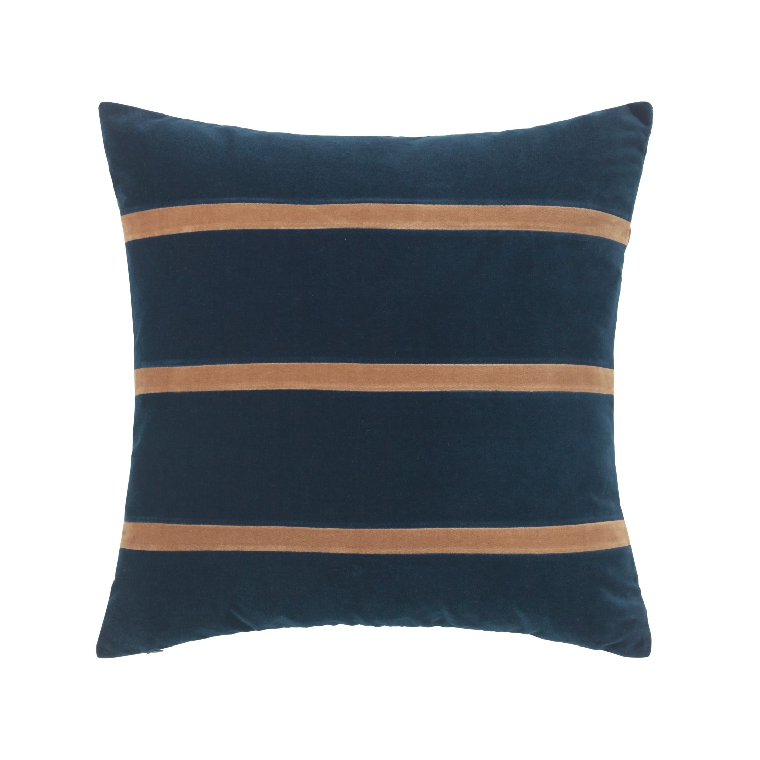 The Gemma Pillow, available in Petrol blue with camel stripes, comes from Danish designer Christina Lundsteen, and is hand made in Denmark. Lundsteen's unique sense of color is apparent throughout her work, as seen in the pairing of this pillow's deep steel blue with warm-toned brown stripes. Upholstered in 100% cotton velvet and filled with small feathers with a high concentration of downs, this pillow is comfortable and adds depth to any living space.