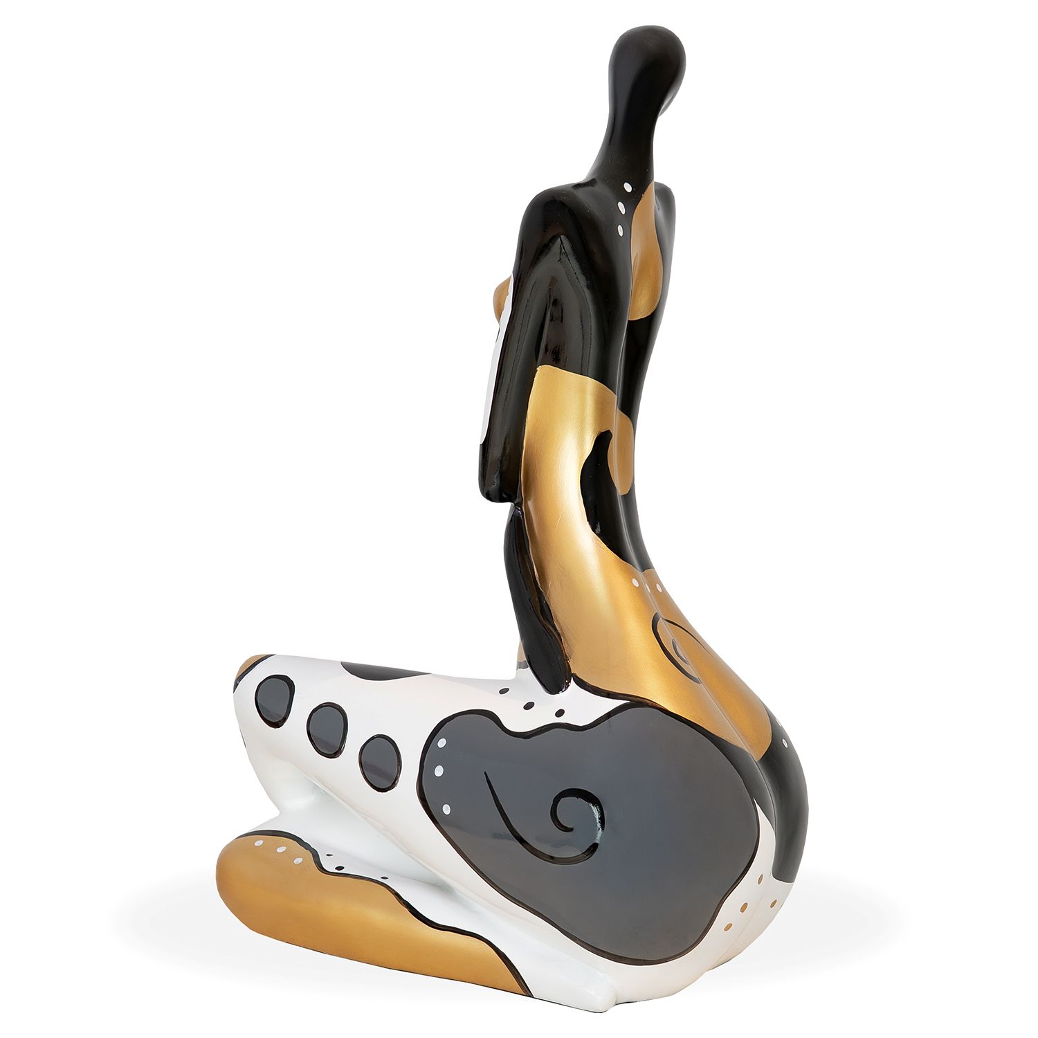 The Gold Queen Sculpture, made of polyresin with a glossy finish, depicts a woman sitting with her legs crossed, head tilted, and one arm cradling the other. Her body is painted in black, white, and gold, with dots, swirls, and organic shapes livening up the surface. Place Gold Queen on any display surface to add a graceful, yet whimsical, accent to your interior.