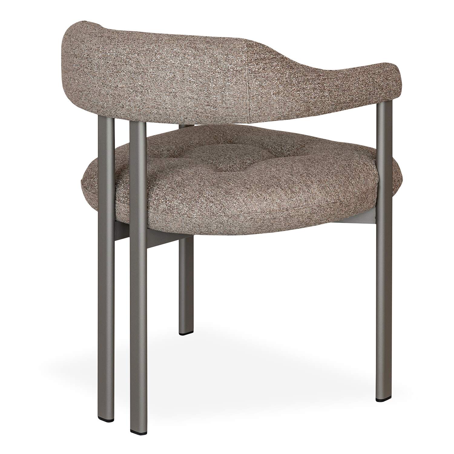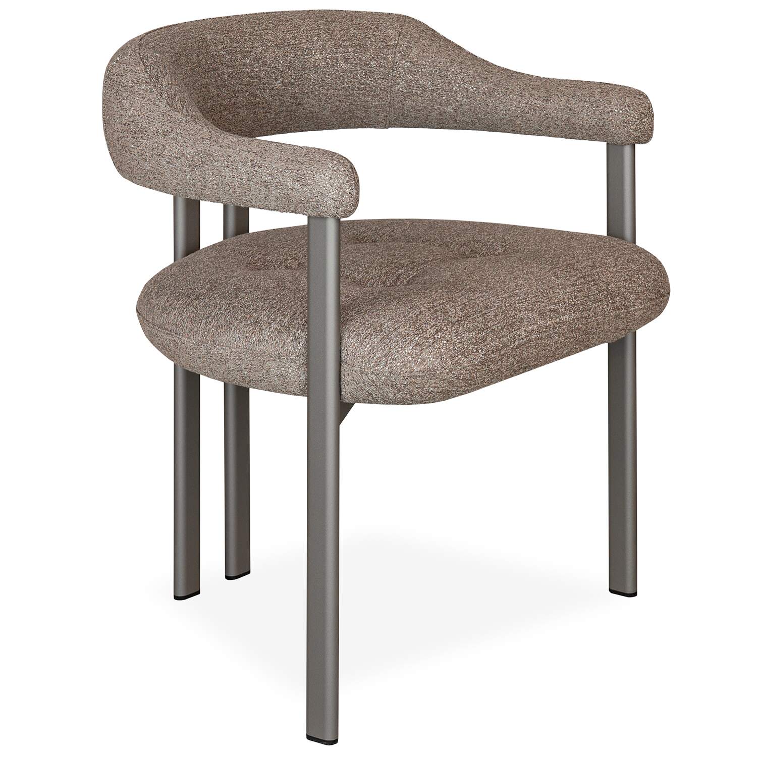 Made by Cattelan Italia, the Greta Dining Chair is upholstered in taupe brown fabric with a boucle-like texture, supported by titanium-lacquered steel legs. Greta's unique design features a floating backrest that curves around to form the armrests, as well as rear legs that are placed closely together for a columnar effect. Each leg has an elliptical cross-section, and the seat cushion is finished with tufted stitching for a welcoming look.