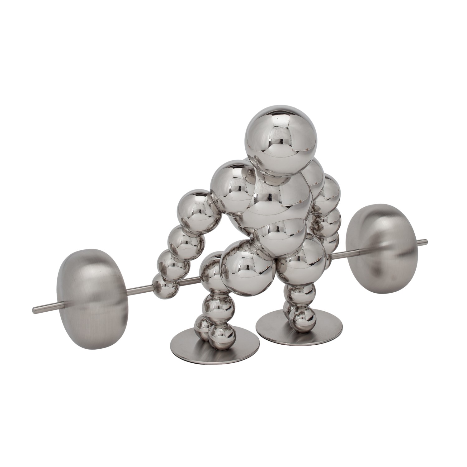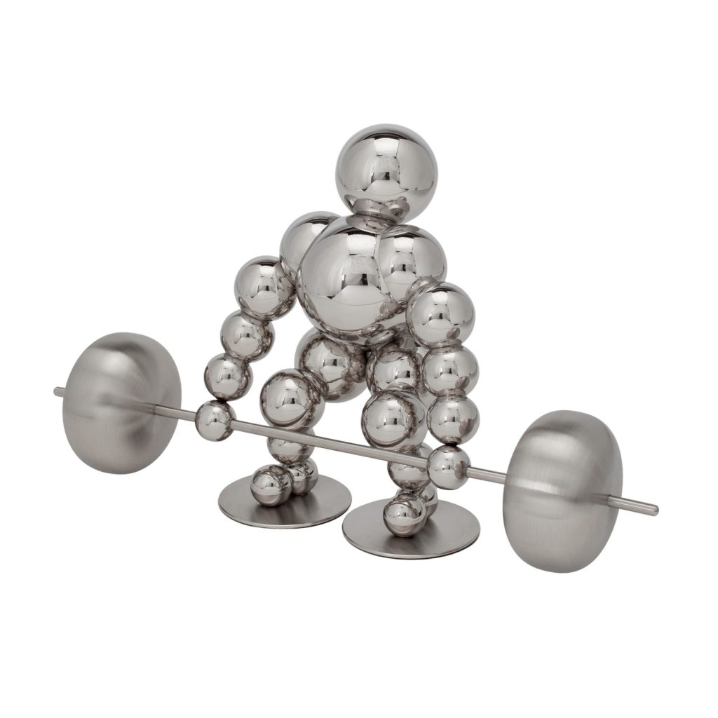 Fashioned from hand-painted stainless steel, the Harbody Sculpture depicts a figure made of reflective silver spheres holding a barbell below their knees, in preparation to lift. The strong and dynamic pose contrasted with the more whimsical design makes Harbody a unique gift for an athlete, bodybuilder, or any lover of both sculpture and sports.