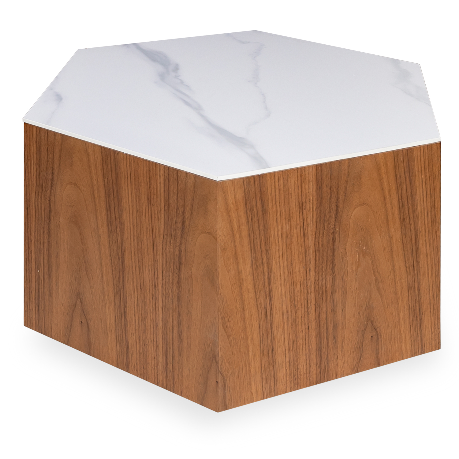 [0] => The Hexagon Table boasts an ultramodern hexagonal shape and a smaller size that lets it function as an end table, display pedestal, or petite coffee table. The elegant marble-like look of the Carrara ceramic top offsets the walnut finish of the base, while hidden wheels allow for easy movement, whether you're re-arranging your interior or simply want tabletop items within closer reach. Pair the Hexagon with its companion tables for a high-impact style statement.