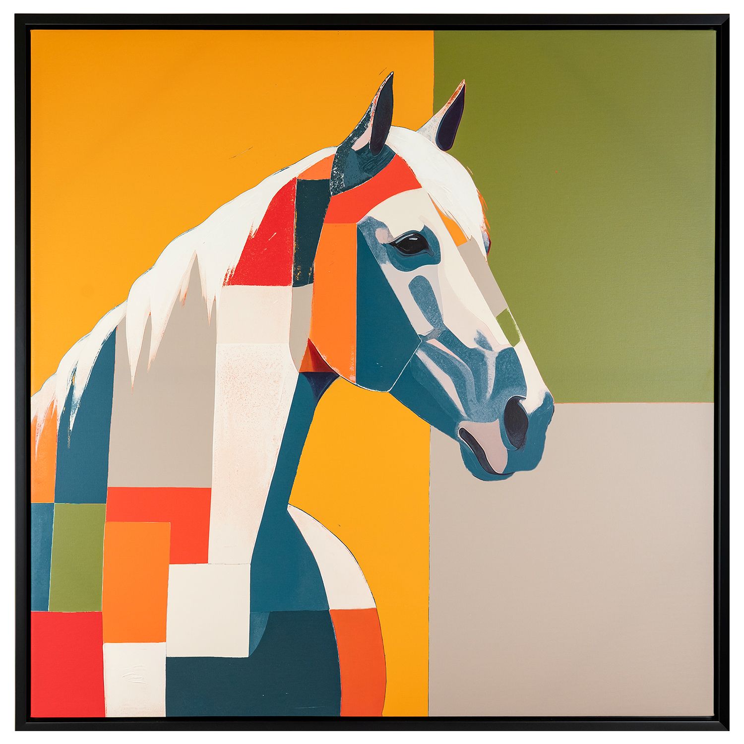 [0] => The Horse Block II Wall Art brings cheerful color and the friendly form of a horse to your interior. Painted on canvas with an included black frame, this artwork features a right-facing horse rendered in colorblocked squares and patches in yellow, green, blue, orange, off-white, and grey. Pair with the companion Horse Block I Wall Art to infuse your space with equine elegance.