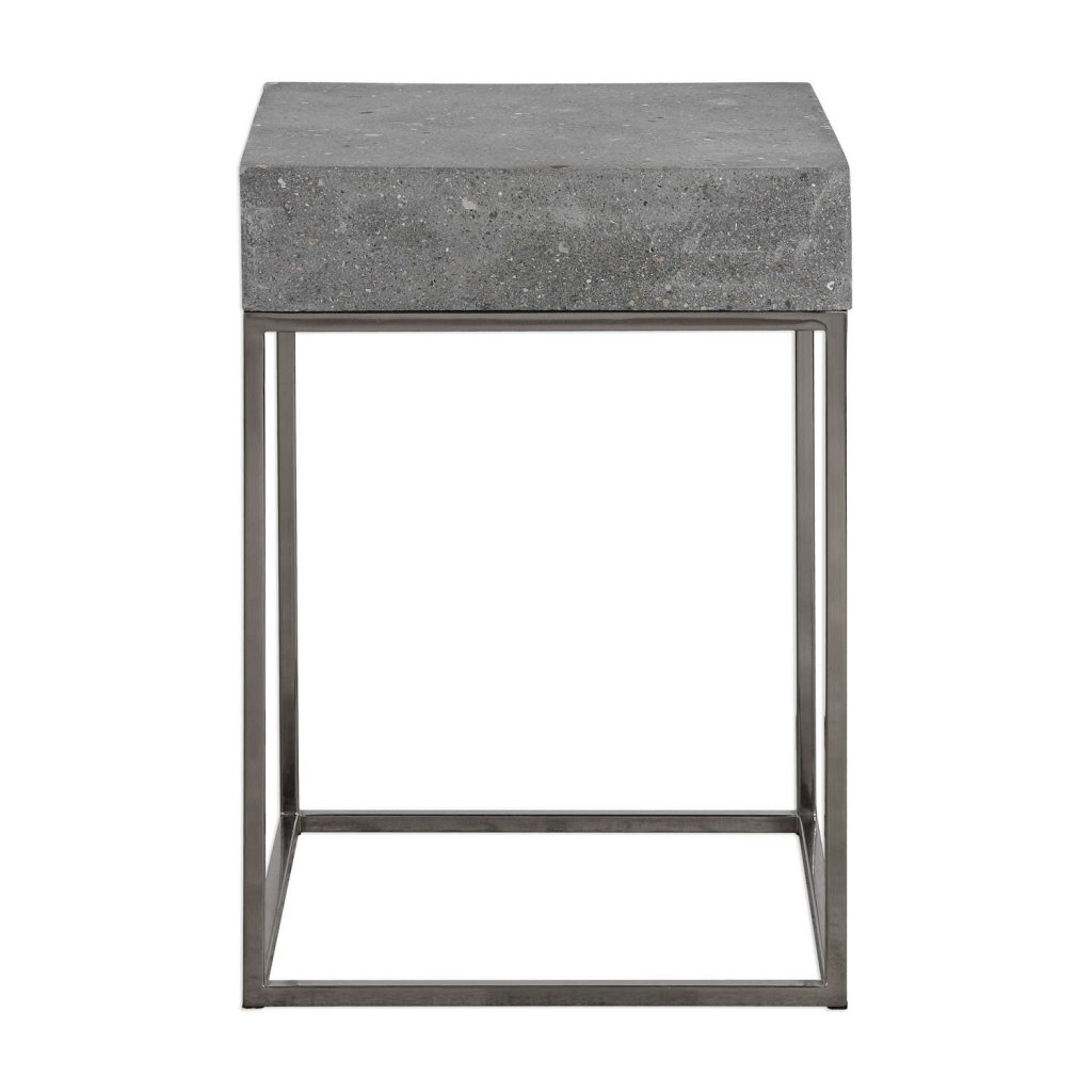 [0] => Add a touch of modern industrial design with the Jude Accent Table. A solid handmade concrete top rests on a sleek steel base, creating a minimalist, structured piece that can complement any contemporary space. Natural variegations in the concrete leave a textured finish.
