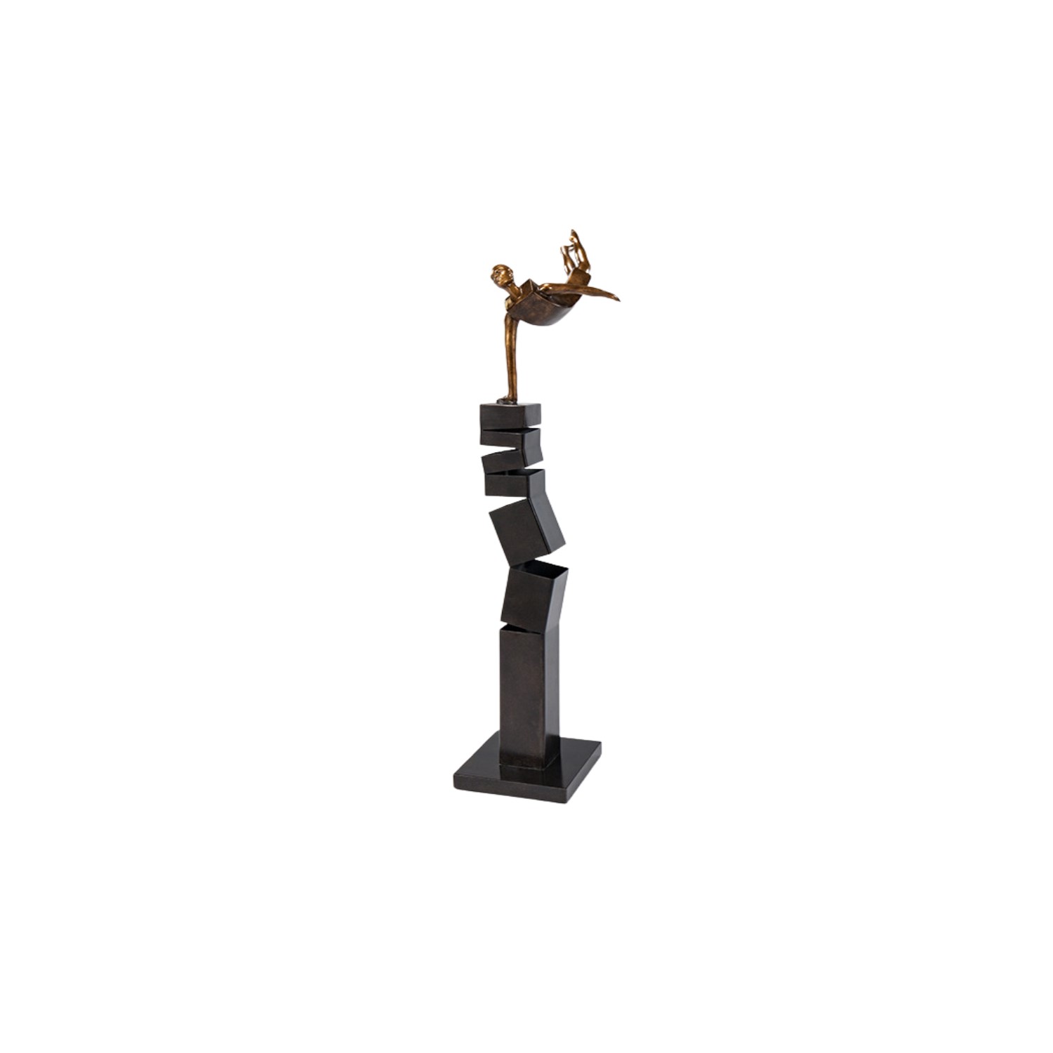 [0] => Dynamic and inspirational, the hand-painted Jump High Sculpture consists of a resin figure balancing on a metal tower that rests on a wooden base. The figure has a gleaming bronze finish and supports itself with one hand as its legs swing through the air in an acrobatic pose. The metal tower has the appearance of angled segments that give an additional sense of precarity and energy to this modern sculpture.