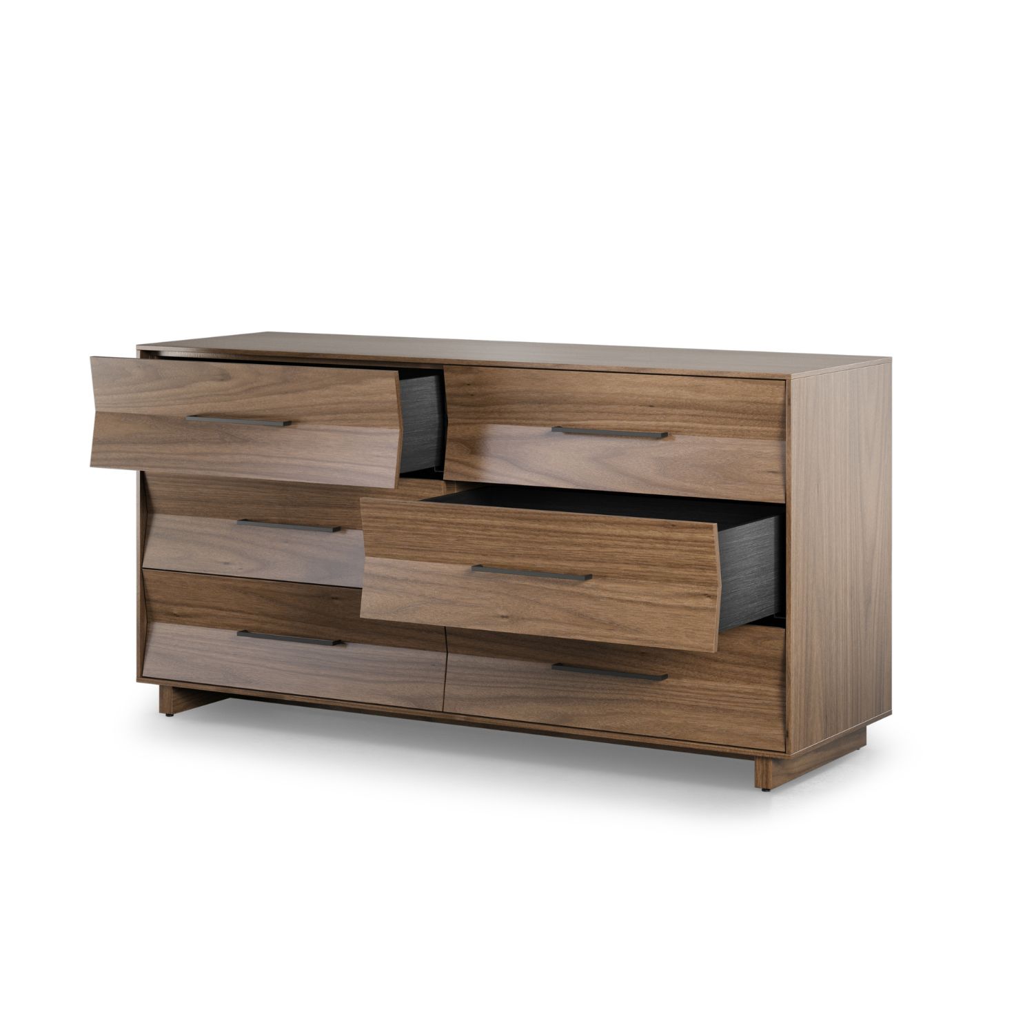 The Kava 6-Drawer Dresser makes a thoroughly modern statement with its sleek lines, crisp angles, and cutting-edge features. Designed by Matthew Weatherly and available with a walnut veneer, Kava features strikingly pleated drawer fronts that reveal precision engineering and an eye for style. Six spacious soft-close drawers offer ample room for your wardrobe, while a removable velvet-lined accessory tray streamlines organization. An interlocking mechanism allows only one drawer on each side to be pulled out at a time, protecting young children from furniture tip-over. Wall anchor safety straps, floor levelers, and cable management wraps add additional layers of safety and functionality. With its bold look and thoughtful design, the Kava 6-Drawer Dresser pairs seamlessly with other Kava items for a beautifully streamlined home.