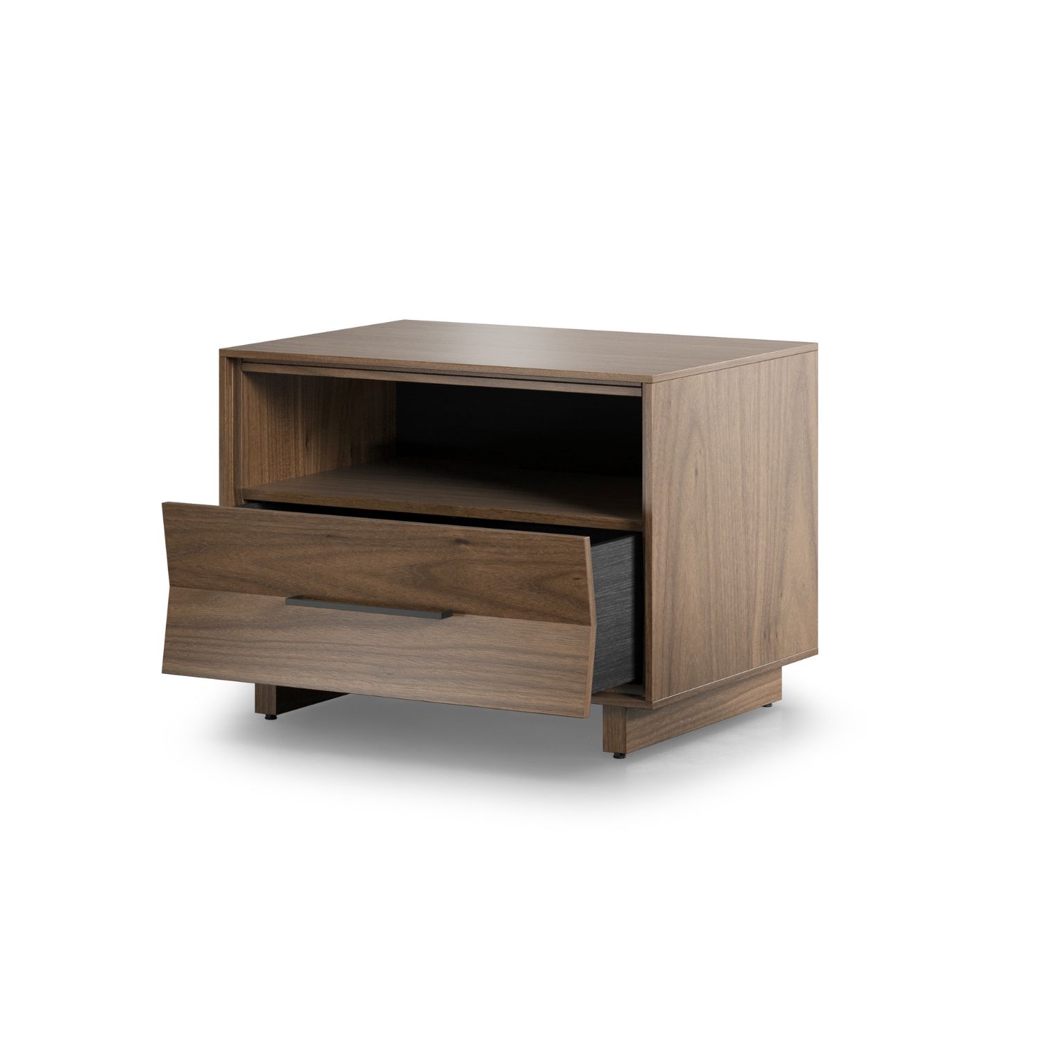 Designed by Matthew Weatherly, the Kava 28" Side Table features walnut veneer, a pleated drawer front, and the ability to function as either a nightstand or side table. Kava's state-of-the-art tabletop can slide forward, keeping items within easy reach by a bedside, or allowing access to an integrated power station on the back. Plug your lamp, clock, or chargers into the power strip, and keep cables organized with built-in wire wraps. An open compartment offers the perfect spot to put books and devices, while a soft-close drawer with a removable accessory tray stores your belongings in style. Pair the Kava 28" Side Table with other Kava items for a beautifully streamlined home.