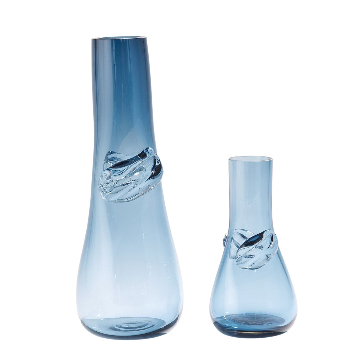 The Knot Large Dark Blue Vase is hand blown from richly tinted art glass and features a tall, tapered silhouette with two sculptural glass knots placed on opposite sides of the neck. Its deep blue hue finish reflects light elegantly, giving it a bold, refined presence. Each vase is shaped and detailed by hand, making every piece truly one of a kind. Display it solo or alongside other sizes to add a layered, artisan touch to consoles, open shelving, or styled entryways.