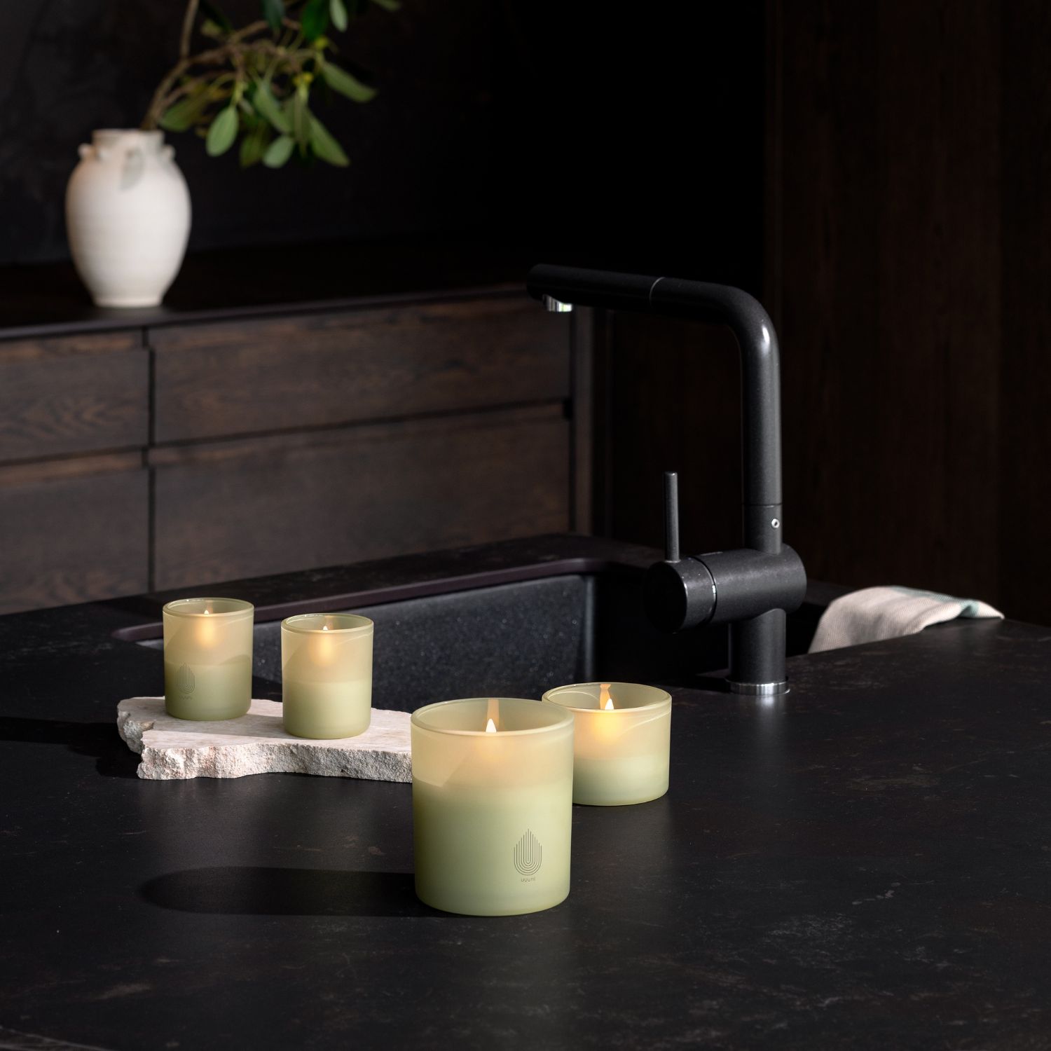 This LED glass candle brings you soft, ambient light with a clean modern look. Crafted with a smooth paraffin finish and light green glass exterior, it uses Uyuni's Signature Flicker™ LED to create a soothing, flame-free ambience filled with a homey charm. This candle works well on shelves, dining tables, consoles, or nightstands, whether used alone or grouped together.
