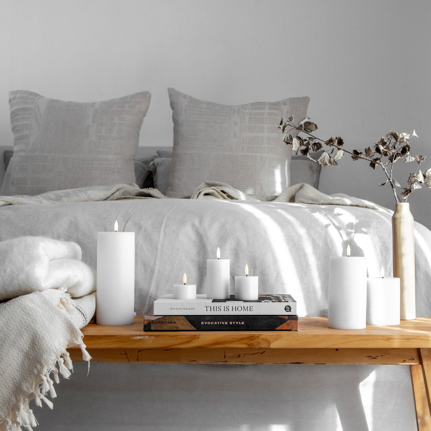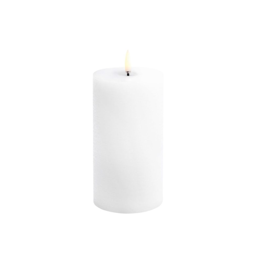 This LED pillar candle brings you warm, ambient light with a simple, rustic look and realistic melt-pool effect. Crafted with a Nordic white paraffin finish, its rustic-textured wax adds a natural, handcrafted character for a more authentic feel. The realistic melt-pool design enhances the illusion of a freshly lit candle, while Uyuni's Signature Flicker™ LED creates a soothing, flame-free ambience filled with a homey charm. This candle works well on mantels, dining tables, consoles, or side tables, and pairs well with other Uyuni pillar sizes for a layered display.