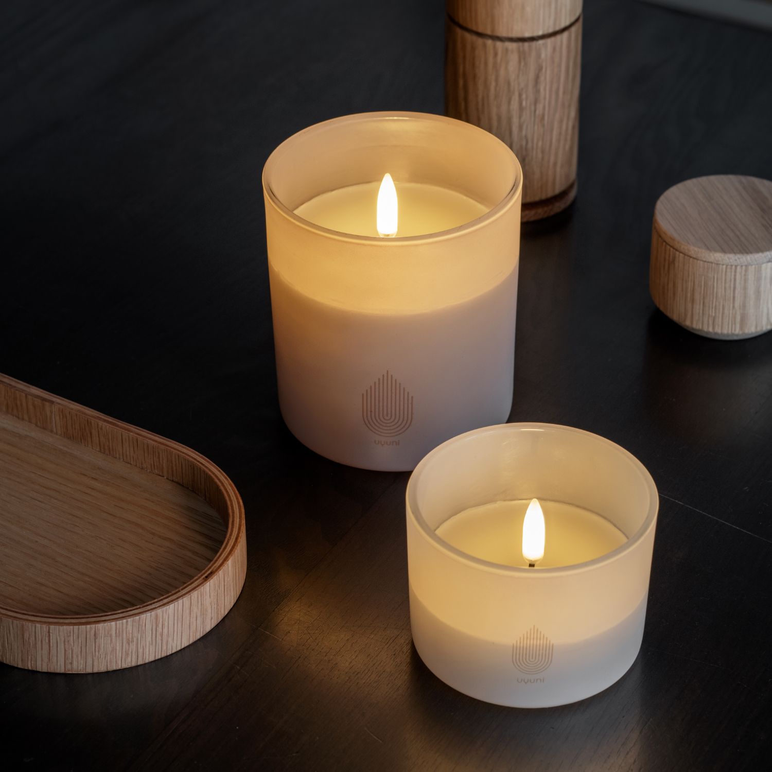 This LED glass candle brings you soft, ambient light in a short, compact form. Crafted with a smooth paraffin finish and beige glass exterior, it uses Uyuni's Signature Flicker™ LED to create a soothing, flame-free ambience filled with a homey charm. This candle works well on shelves, dining tables, consoles, or nightstands, whether used alone or grouped together.