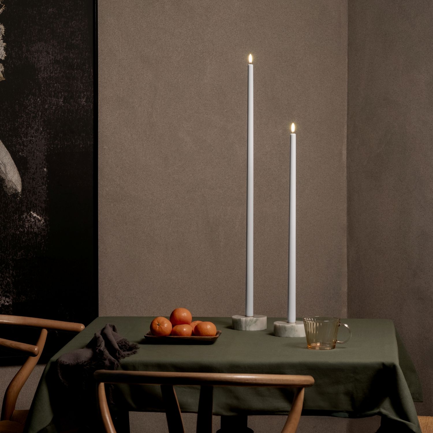 This LED tall taper candle brings you elegant, ambient light with a clean, refined look. Crafted with a smooth virgin paraffin wax finish in Nordic white, this candle exudes a crisp, polished feel suited for both formal and relaxed settings. It uses Uyuni's Signature Flicker™ LED to create a soothing, flame-free ambience filled with a homey charm -- perfect for dining tables, console surfaces, mantelpieces, or paired in candleholders.