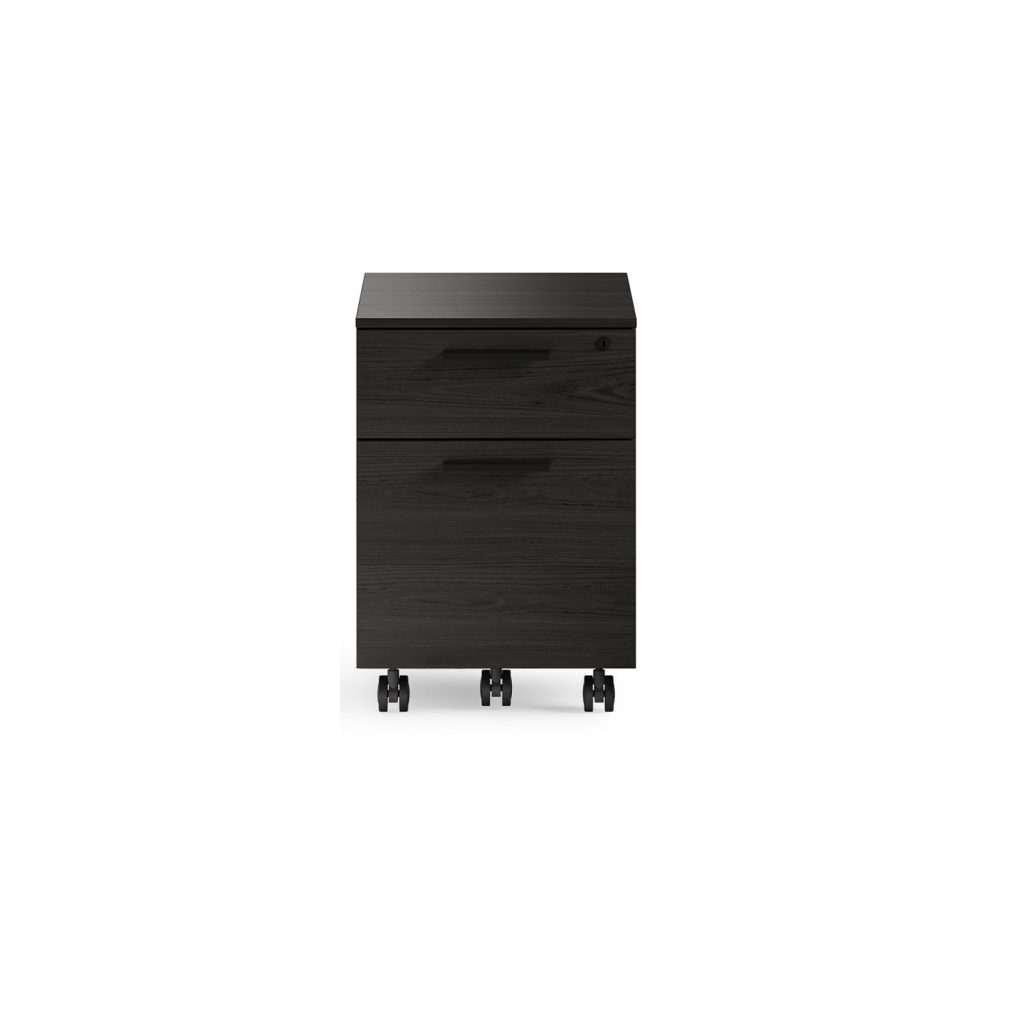 [0] => The Linea Mobile File Pedestal is the perfect accompaniment to any office setup. Its size and mobility allow it to tuck under the Linea Desk, function as a printing station, or sit standalone wherever you need some extra storage. A smaller supply drawer provides space for essentials, and the larger file drawer's adjustable filing system can store Legal, Letter, A4, and Foolscap size hanging folders. The locking wheels ensure the pedestal will stay in place, and the drawer key lock keeps files secure. Shown in charcoal-stained ash hardwood veneer.