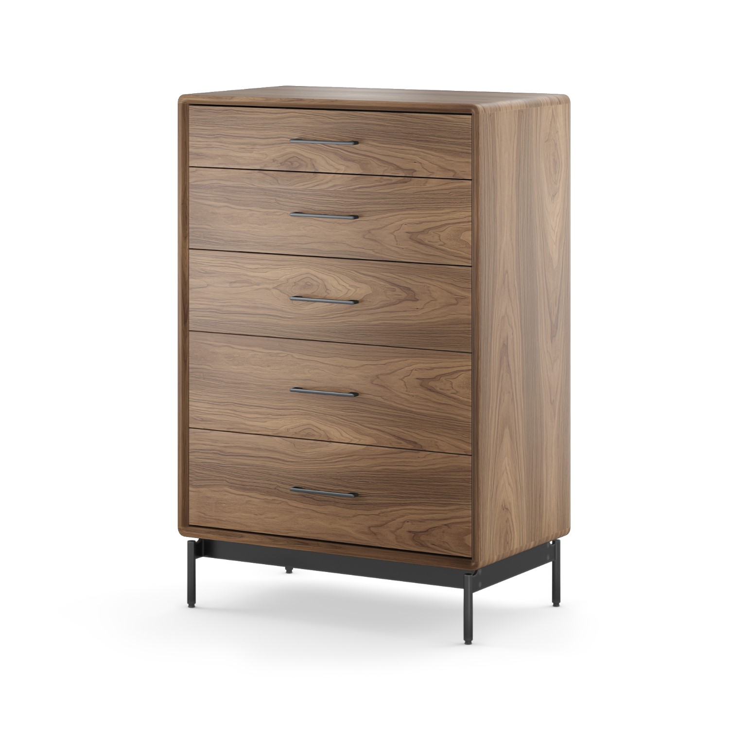 Designed by Matthew Weatherly for BDI, the Linq 5-Drawer Dresser is elegant, spacious, and engineered with functionality and safety as top priorities. Linq's walnut veneer and rounded corners evoke mid-century modern design, while black steel legs with adjustable levelers help it stand securely on any floor. A state-of-the-art interlocking mechanism allows only one drawer to be pulled out at a time -- protecting young children from furniture tip-over. Each drawer closes softly with a gentle push, while wall anchor safety straps provide an extra measure of security. As an added bonus, Linq comes with wire management wraps on the back to help fight cord clutter. With its minimalist profile and thoughtful design, the Linq 5-Drawer Dresser pairs seamlessly with other items in the Linq collection for a beautifully streamlined home.