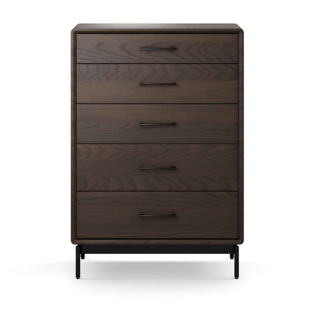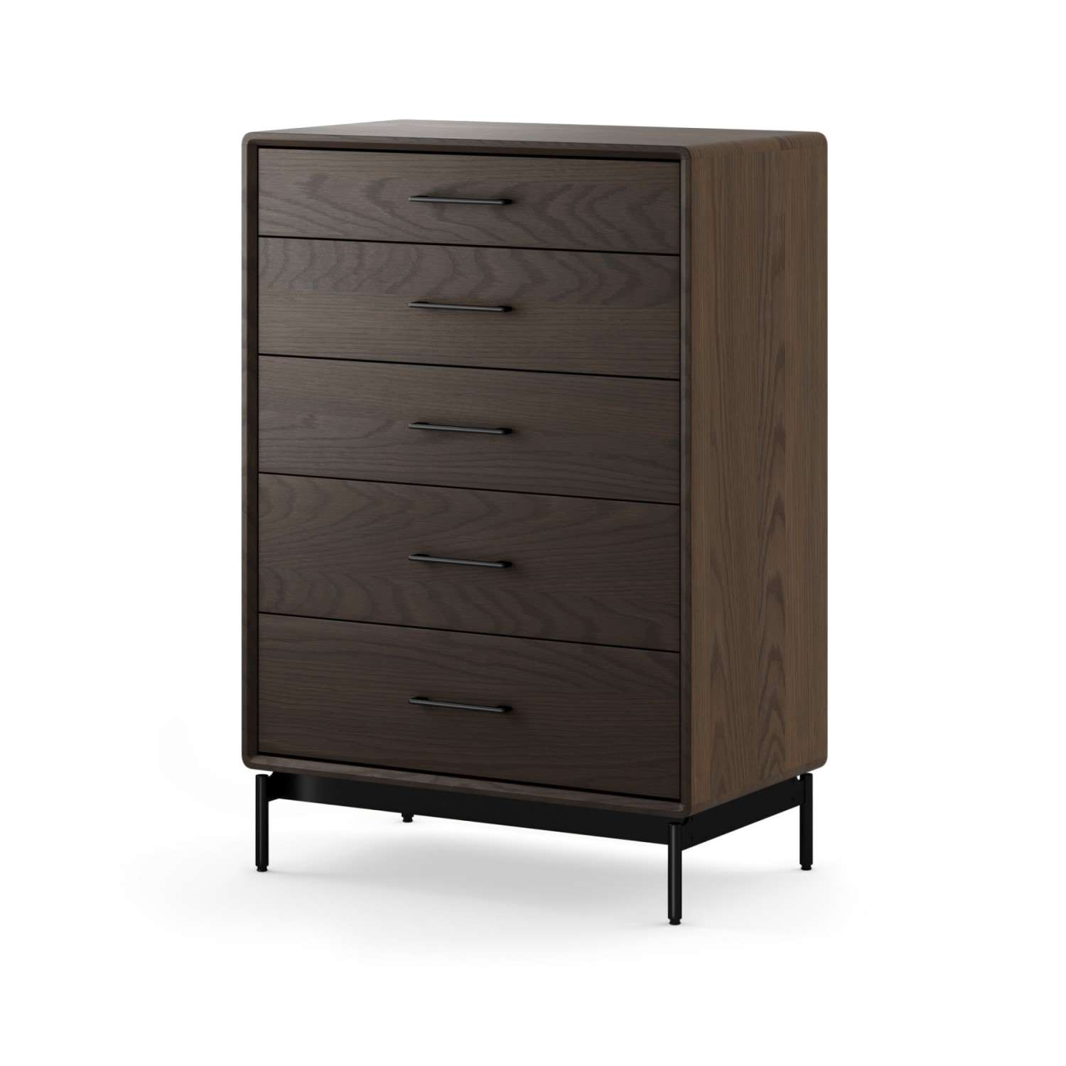 Designed by Matthew Weatherly for BDI, the Linq 5-Drawer Dresser is elegant, spacious, and engineered with functionality and safety as top priorities. Linq's mocha veneer and rounded corners evoke mid-century modern design, while black steel legs with adjustable levelers help it stand securely on any floor. A state-of-the-art interlocking mechanism allows only one drawer to be pulled out at a time -- protecting young children from furniture tip-over. Each drawer closes softly with a gentle push, while wall anchor safety straps provide an extra measure of security. As an added bonus, Linq comes with wire management wraps on the back to help fight cord clutter. With its minimalist profile and thoughtful design, the Linq 5-Drawer Dresser pairs seamlessly with other items in the Linq collection for a beautifully streamlined home.