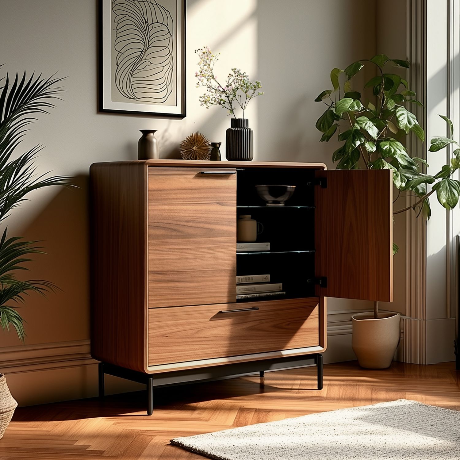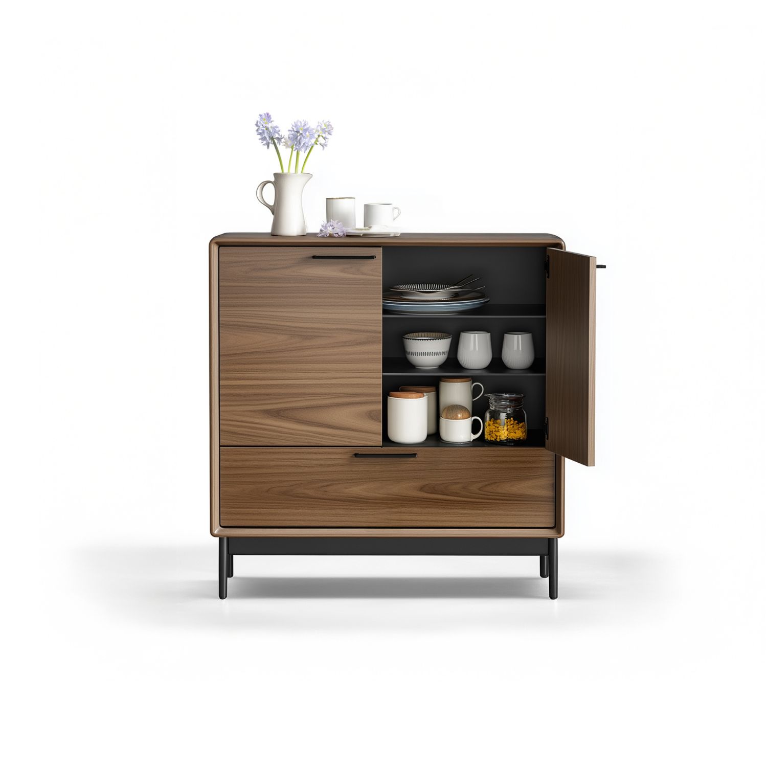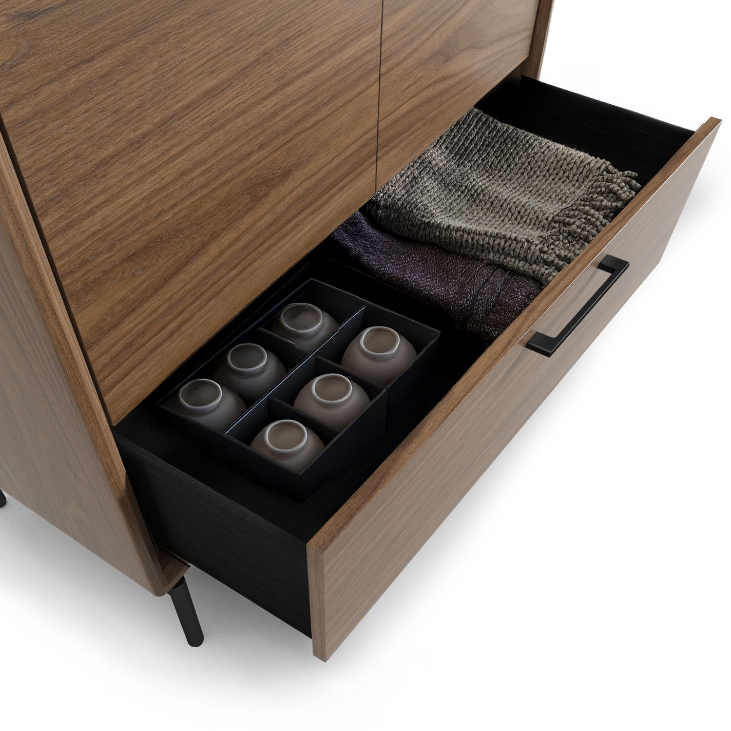 Designed by Matthew Weatherly for BDI, the Linq Entry Cabinet offers concealed storage in a compact, refined form made for entryways, hallways, or any spot where a little extra organization is needed. Linq features a natural walnut finish with dual soft-close doors, a spacious full-width drawer, and two adjustable interior glass shelves to store both everyday essentials and seasonal accessories. Soft-close mechanisms, a black fabric drawer liner, and threaded shelf supports with cushioned rings add thoughtful functionality that stands up to the demands of daily life.