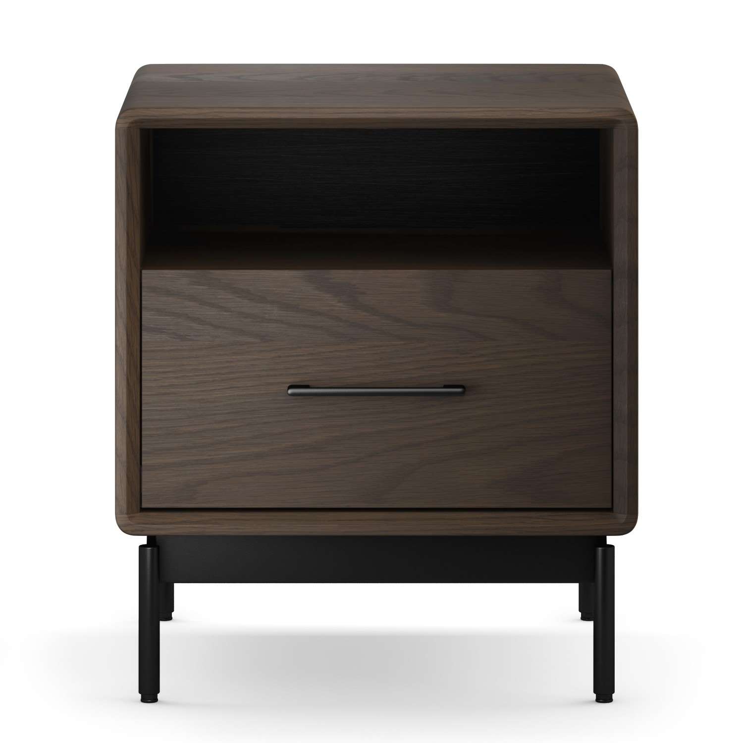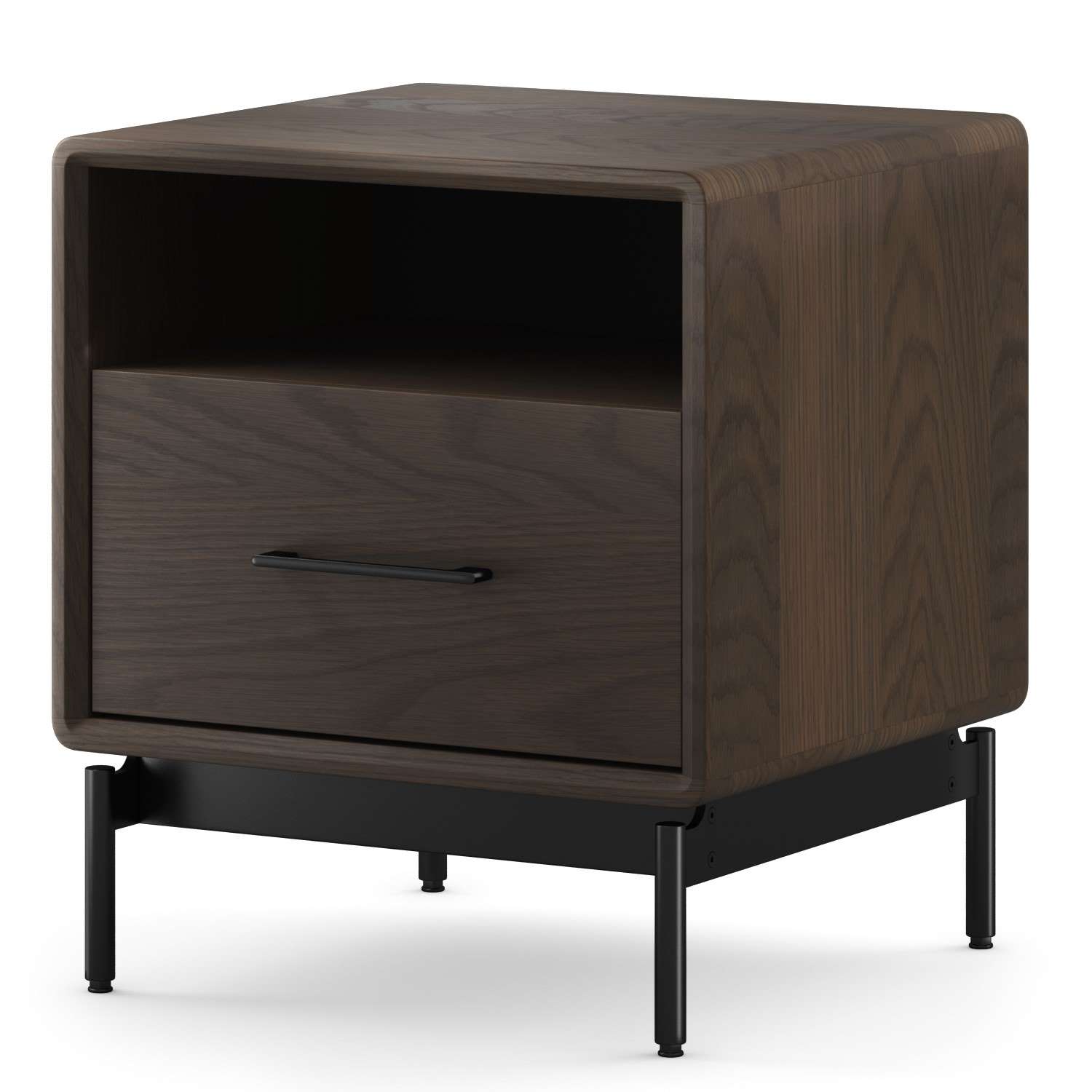 Linq is more than just tech-savvy -- it's elegantly and smartly designed as well. An open compartment offers the perfect spot to stash magazines and books, while a textured lower drawer with a soft-close mechanism stores your belongings in style. Linq's mocha veneer and rounded corners evoke mid-century modern design, while a black steel base with adjustable levelers help it stand securely on any floor. Pair the Linq 22" Side Table with other items in the Linq collection for a beautifully streamlined home.