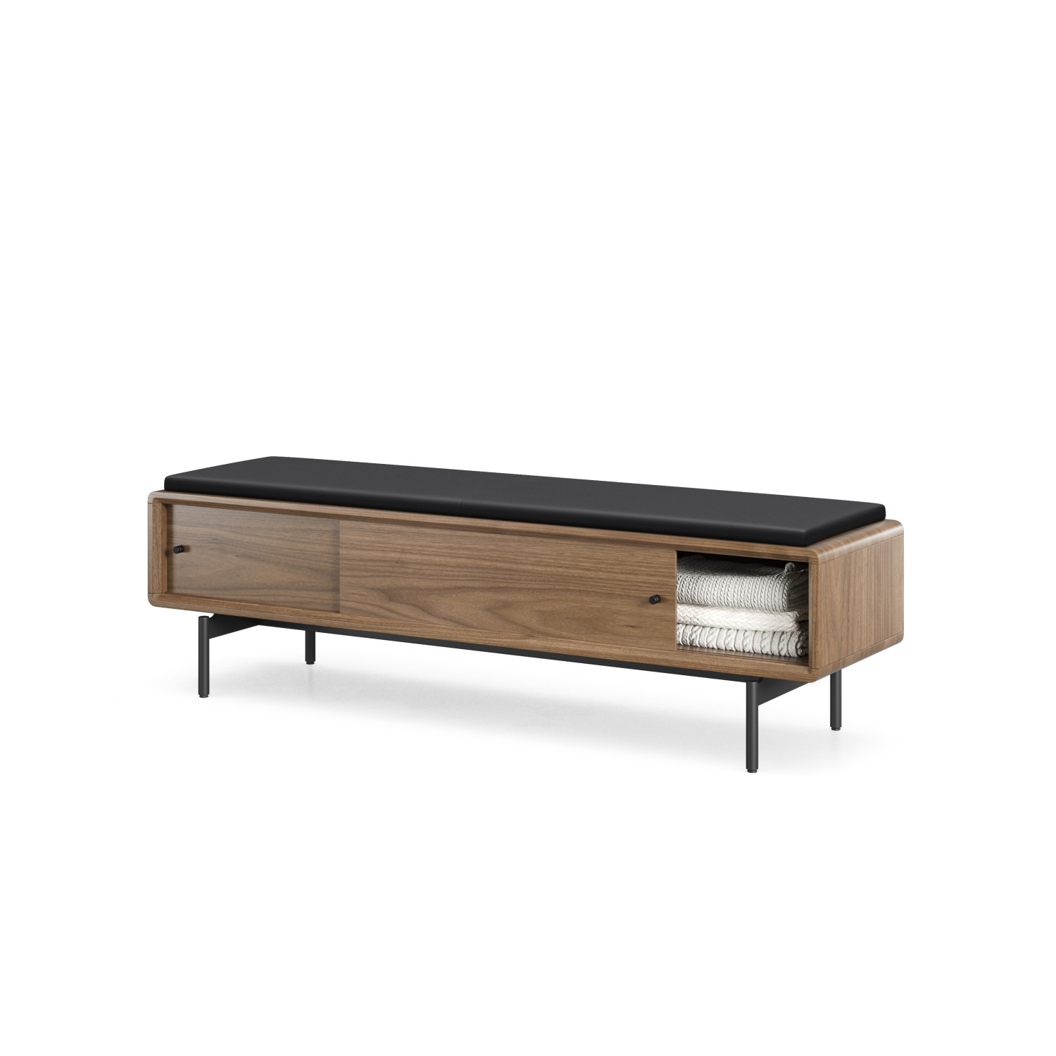 Designed by Matthew Weatherly for BDI, the Linq Storage Bench is elegant, spacious, and multifunctional. Linq's walnut veneer and rounded corners evoke mid-century modern design, while a removable cushion in pepper black semi-aniline leather offers an extra layer of comfort. A spacious storage compartment keeps household items neatly stashed behind two smoothly sliding doors. Seamlessly versatile, the Linq Bench can be placed at the foot of a bed, in a hallway, or in nearly any other living space to offer a sleek seating solution. It also pairs perfectly with other items in the Linq collection for a beautifully streamlined home.