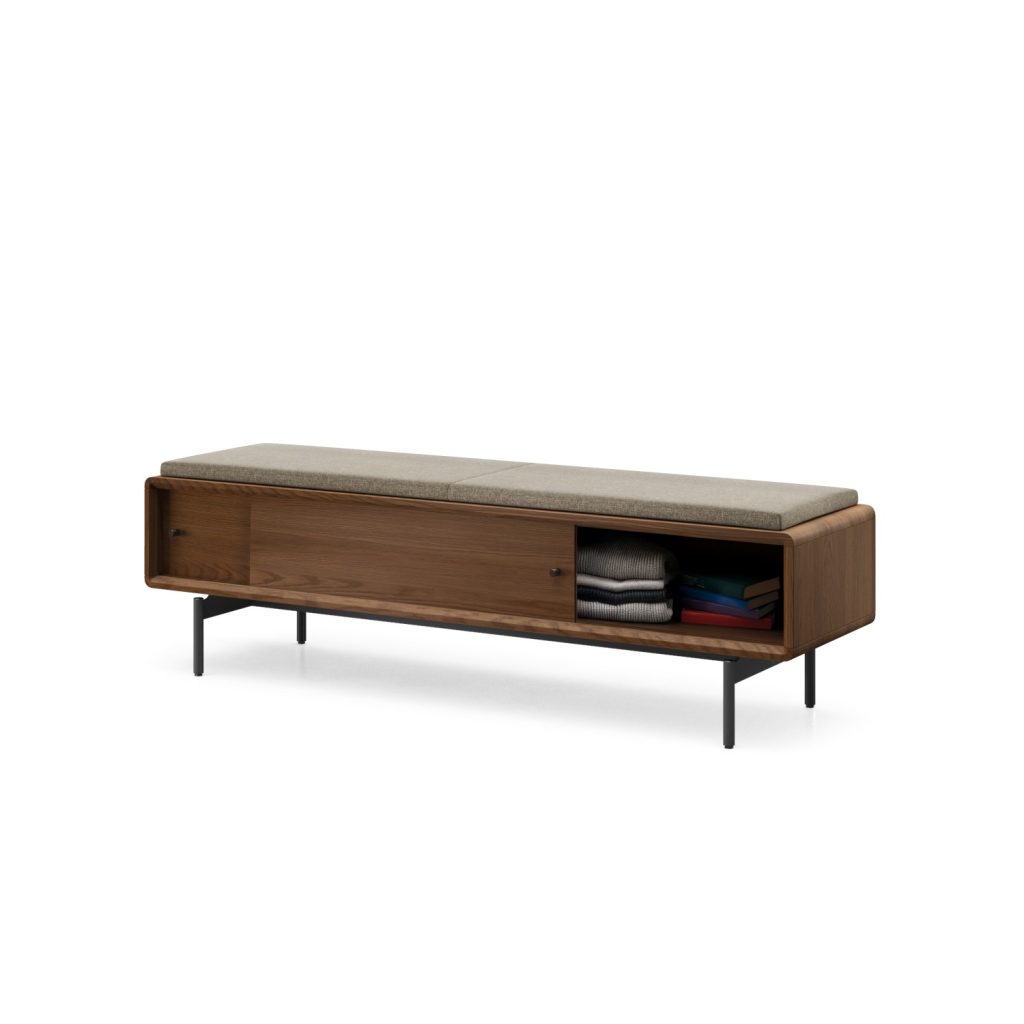 Designed by Matthew Weatherly for BDI, the Linq Storage Bench is elegant, spacious, and multifunctional. Linq's mocha wood finish and rounded corners evoke mid-century modern design, while a removable cushion in pecan brown performance fabric offers an extra layer of comfort. A spacious storage compartment keeps household items neatly stashed behind two smoothly sliding doors. Seamlessly versatile, the Linq Bench can be placed at the foot of a bed, in a hallway, or in nearly any other living space to offer a sleek seating solution. It also pairs perfectly with other items in the Linq collection for a beautifully streamlined home.