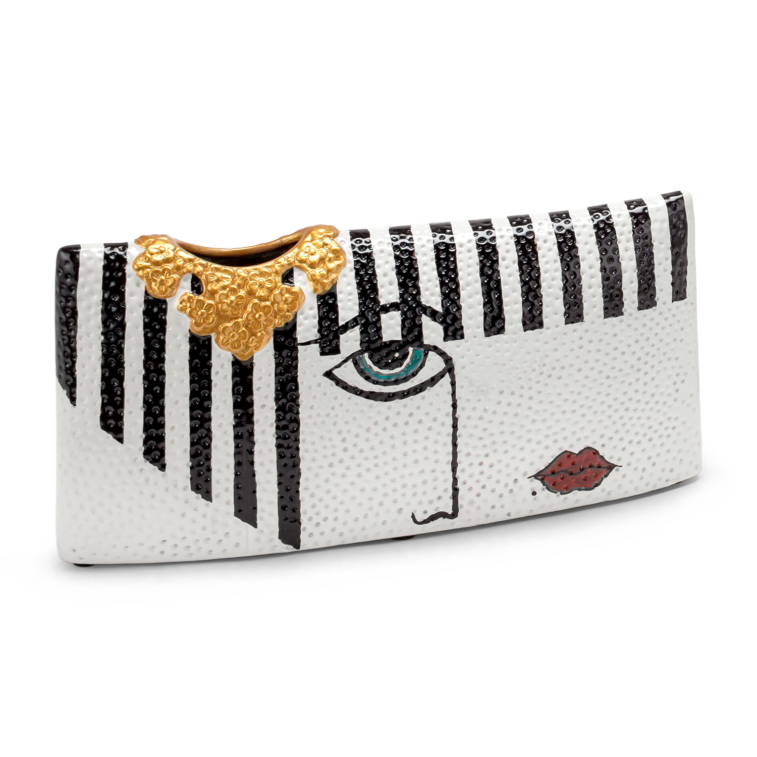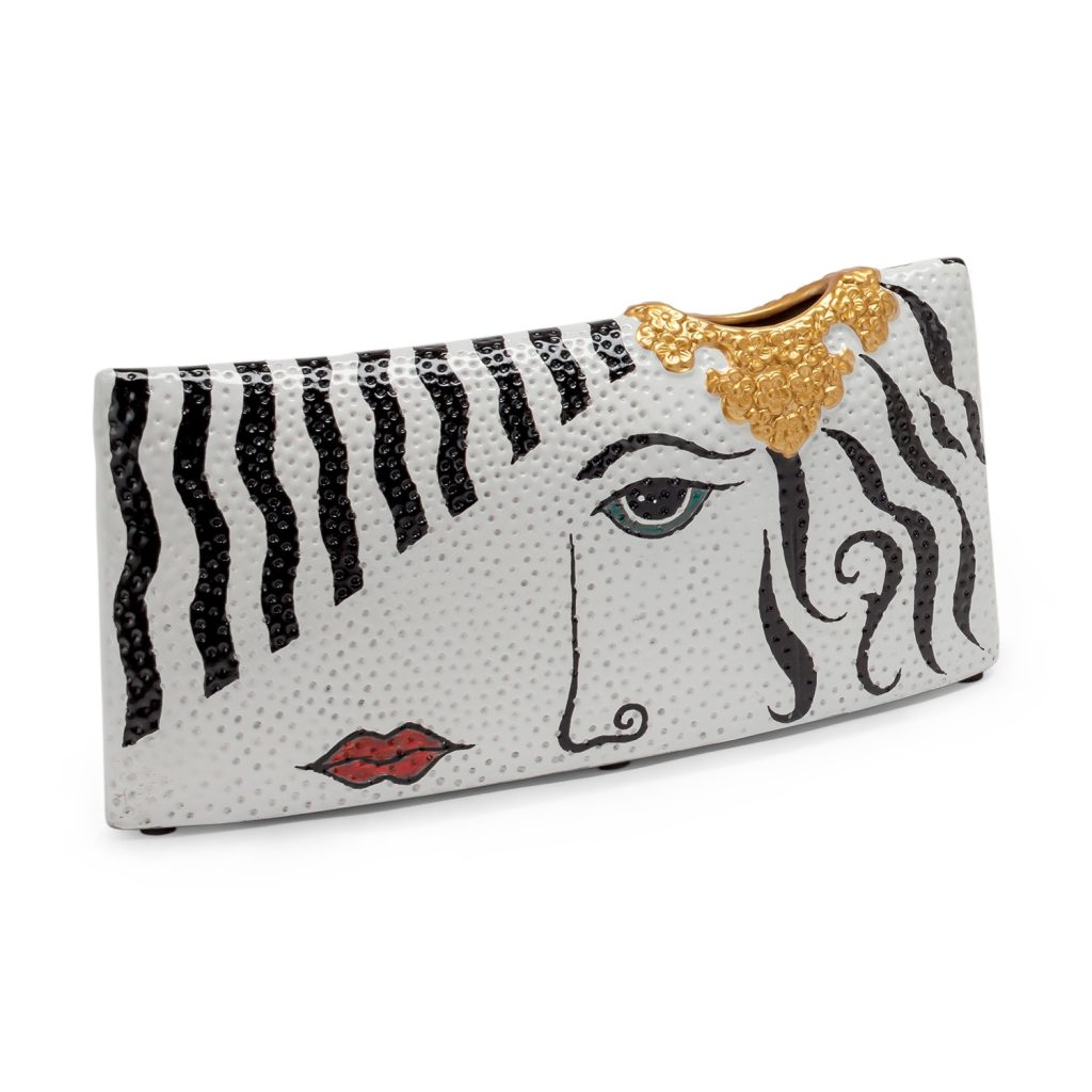 [0] => luciana wide 17x4x9 vase white, black, gold and red hand painted face