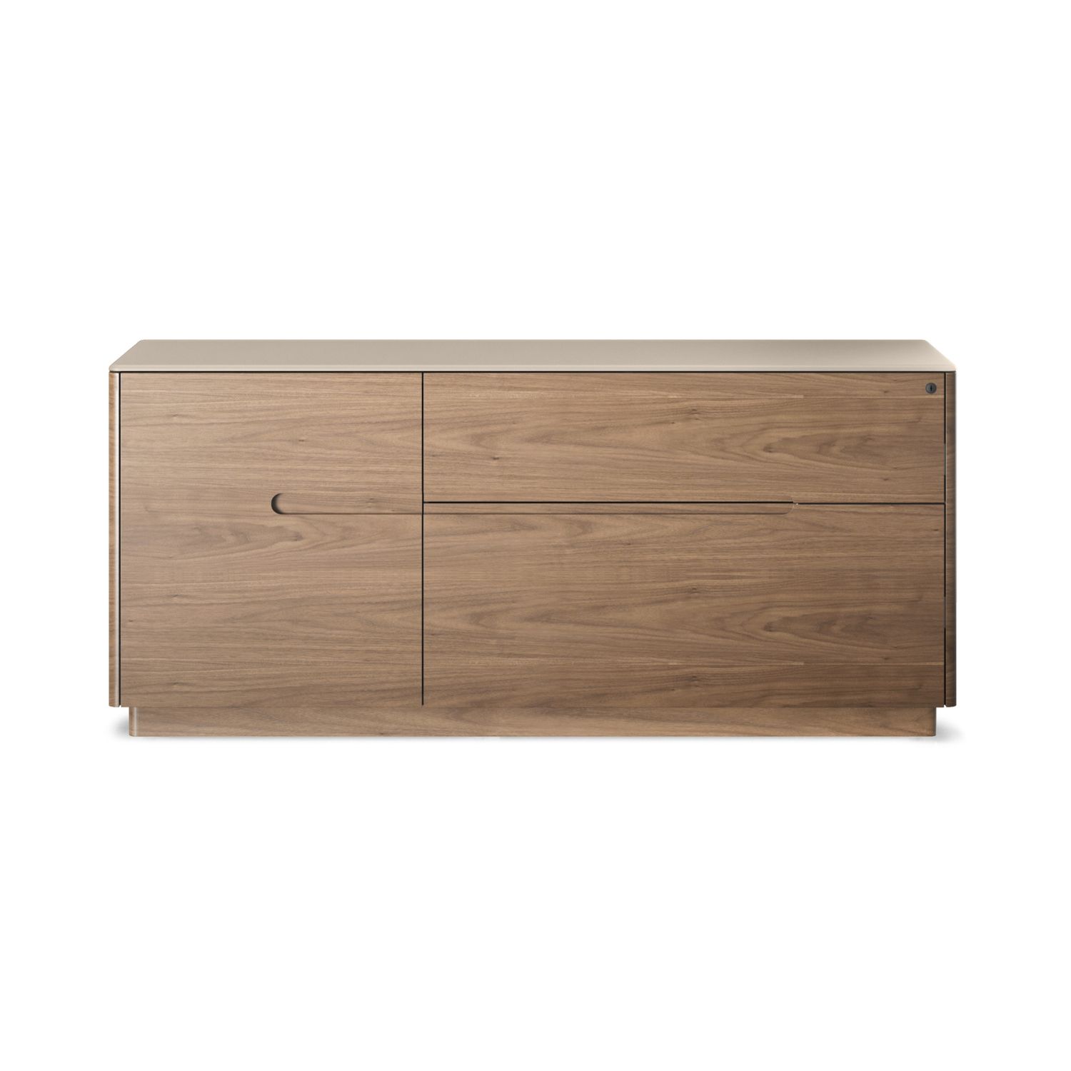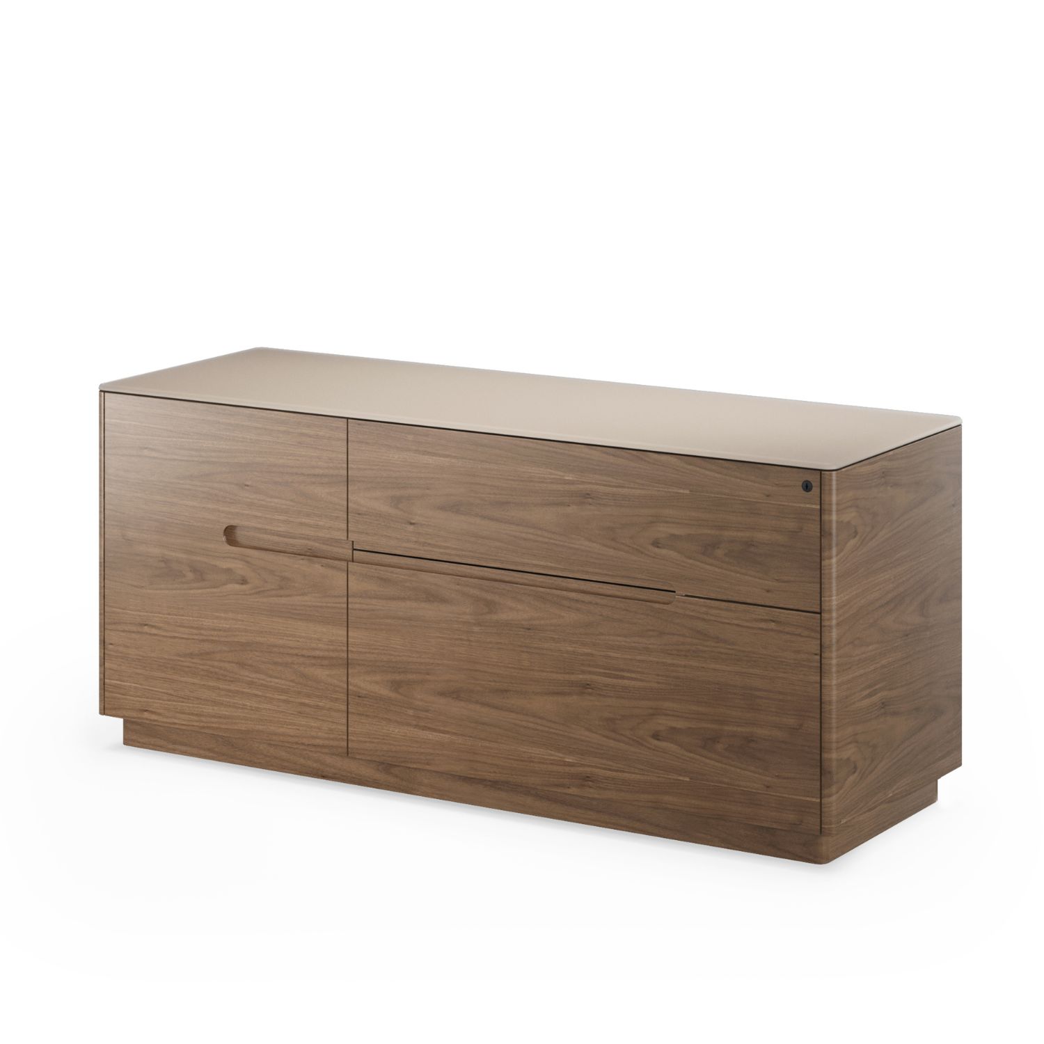 The ideal companion for any Luma Desk, the Luma Multifunction Cabinet elevates your workday with refined, minimalist style and a wealth of functional features. Luma boasts a dune beige top made of fingerprint-resistant satin-etched glass, supported by a natural walnut body. The left compartment has an adjustable glass shelf and a pull-out tray for easy access to a printer or shredder. On the right, two lockable drawers keep documents secure, with a removable accessory tray in the top drawer and hanging rails for file storage in the bottom drawer. As a bonus, Luma's rear panel is removable for easy setup of cables.
