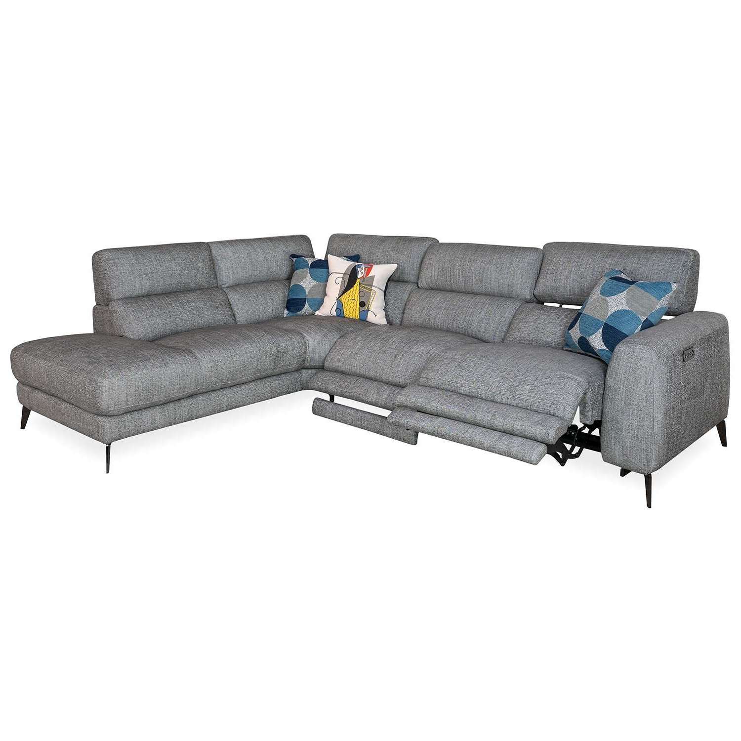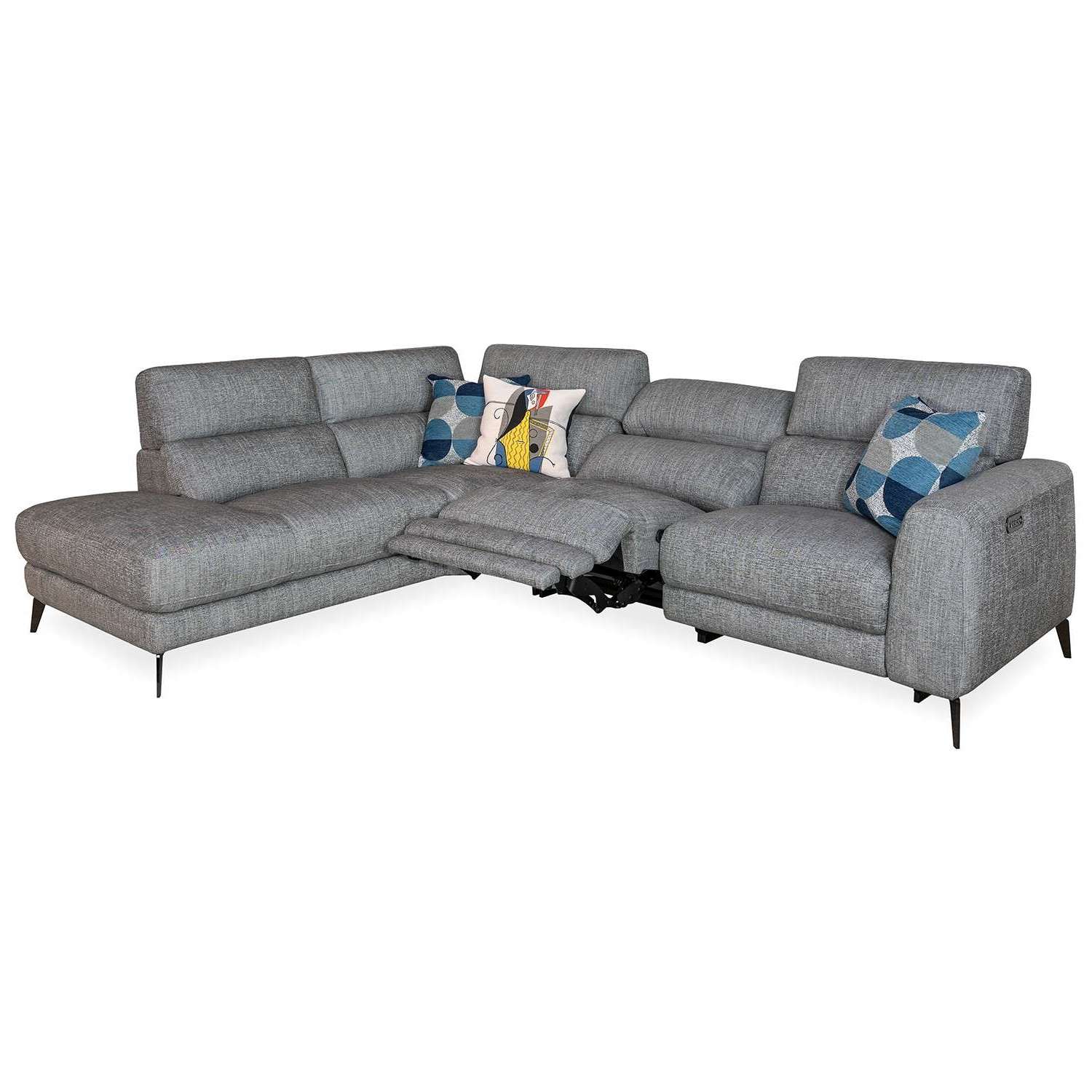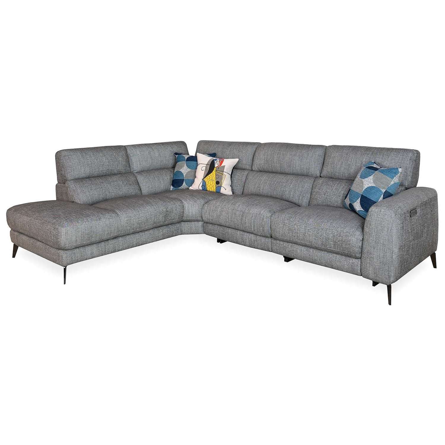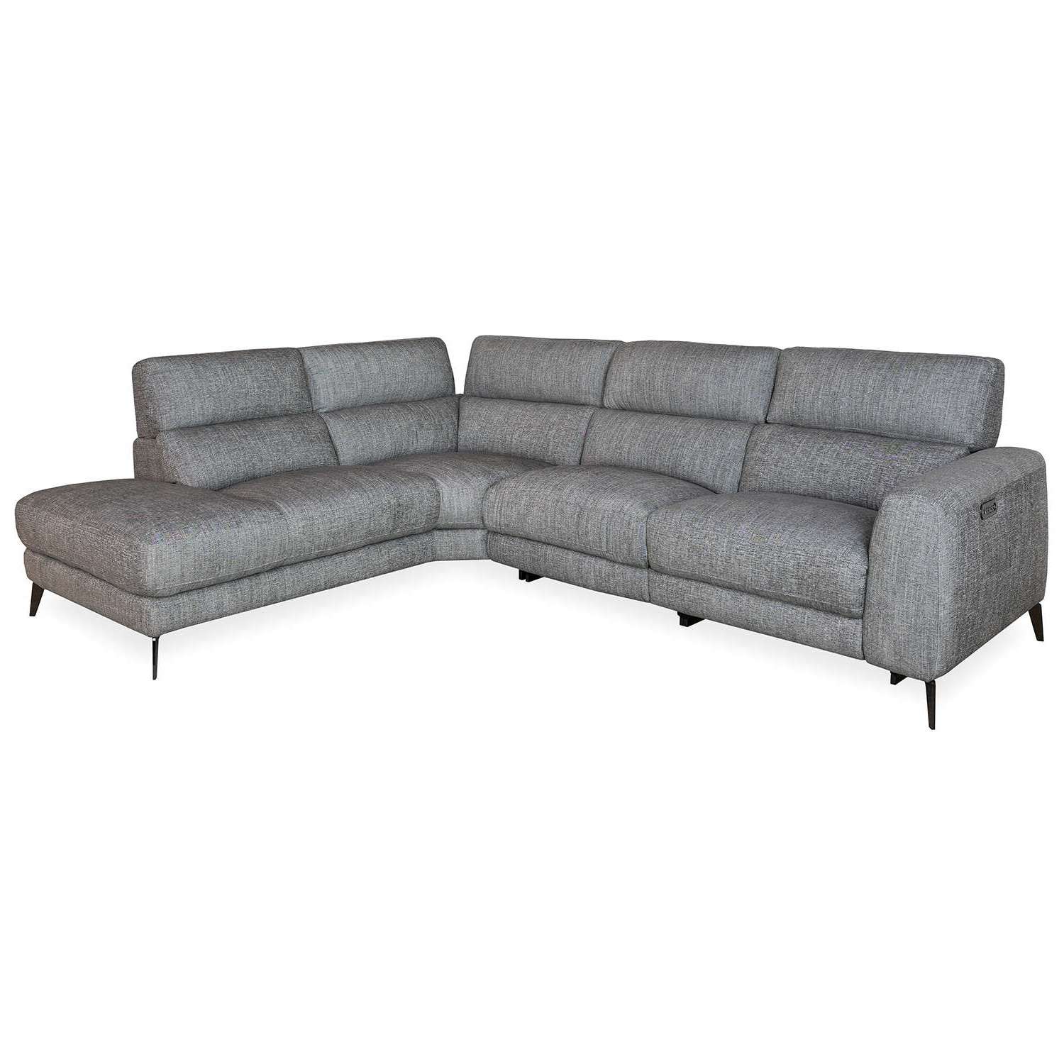 The Mackenzie Power Sectional has clean, contemporary style, with two power motion seats, soft charcoal grey fabric, and plush cushions with a buoyant feel. The power seats allow you to perfectly adjust the reclining angle of the footrests and headrests to your preference, while no-sag spring support in the cushioning ensures lasting comfort. Angular metal legs and a built-in USB port add the finishing touches to this timeless yet functional sectional.