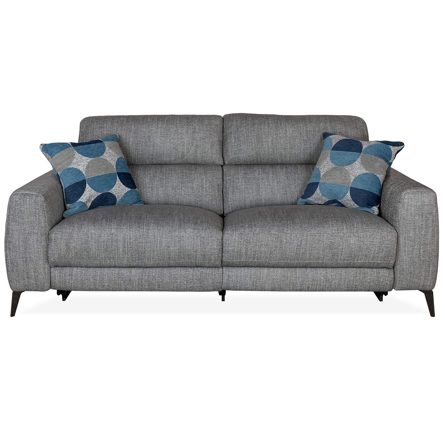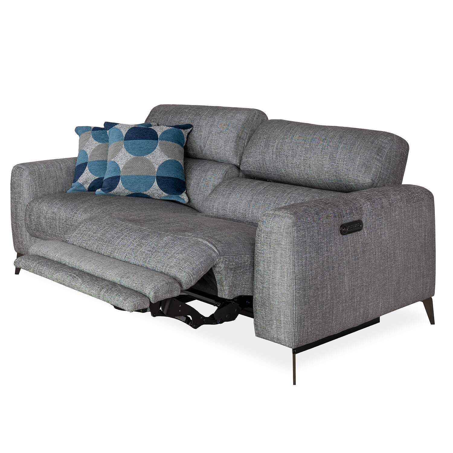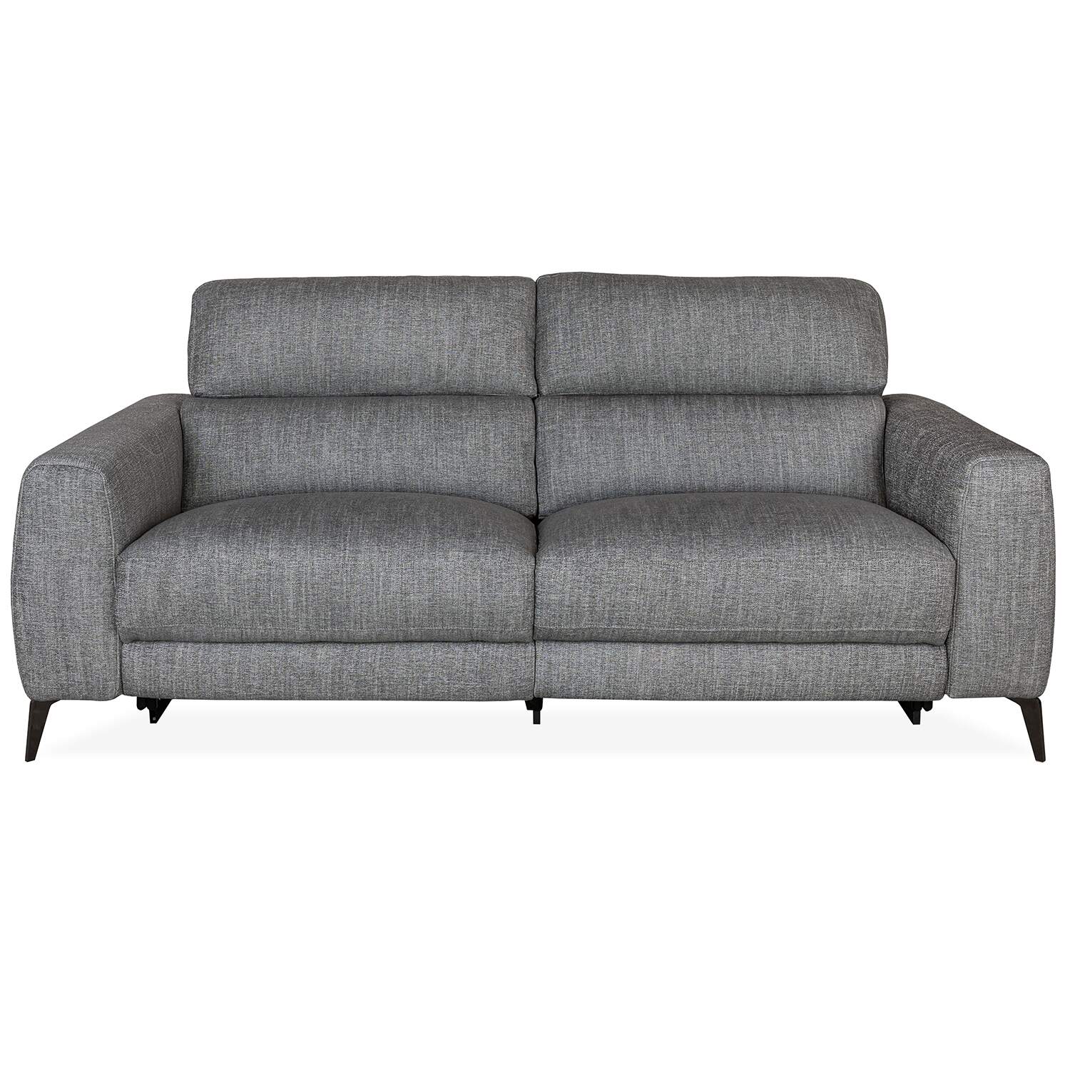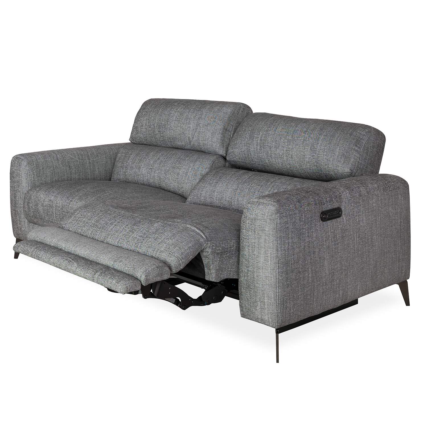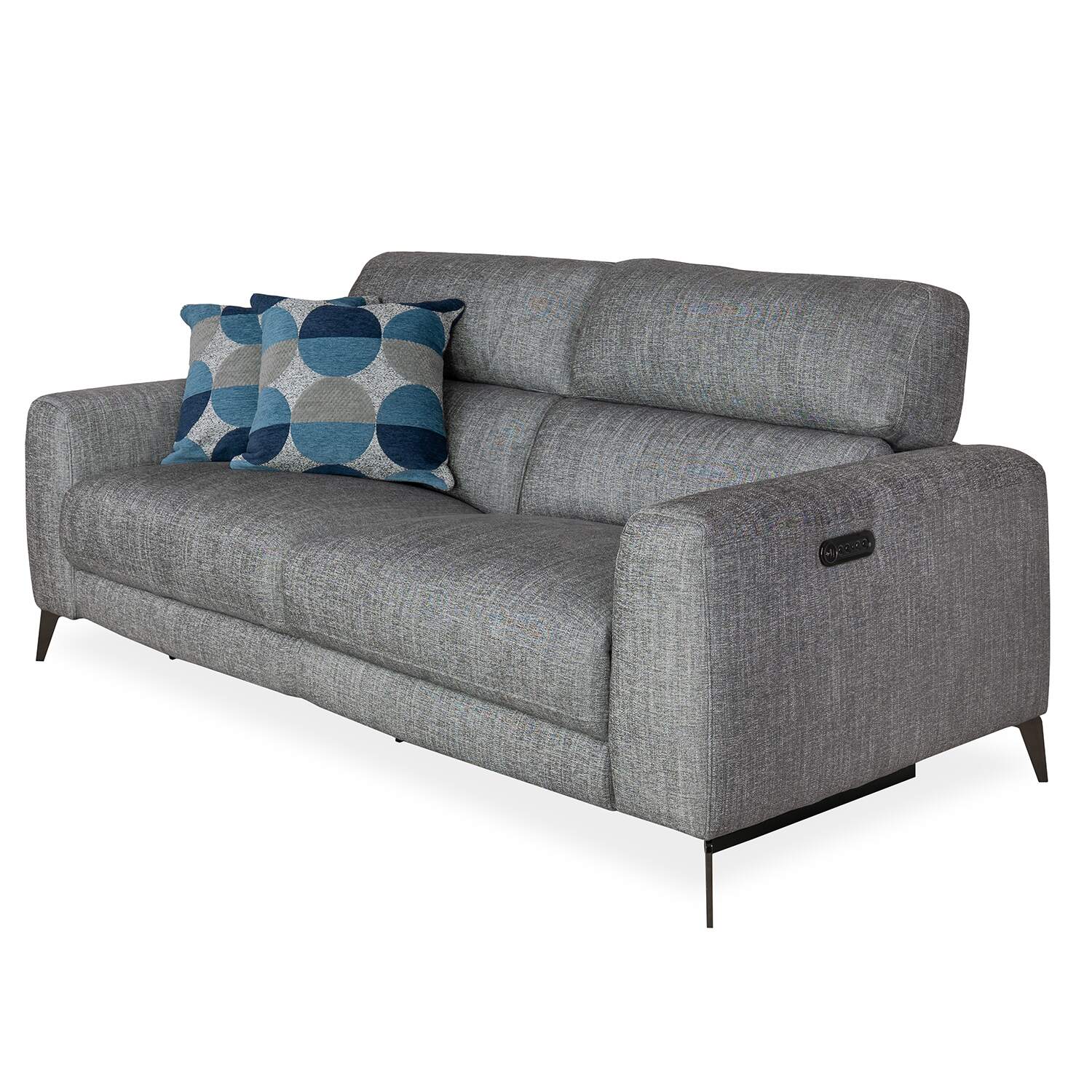 The Mackenzie Power Sofa has clean, contemporary style, with two power motion seats, soft charcoal grey fabric, and plush cushions with a buoyant feel. The power seats allow you to perfectly adjust the reclining angle of the footrests and headrests to your preference, while no-sag spring support in the cushioning ensures lasting comfort. Angular metal legs and built-in USB ports add the finishing touches to this timeless yet functional sofa.