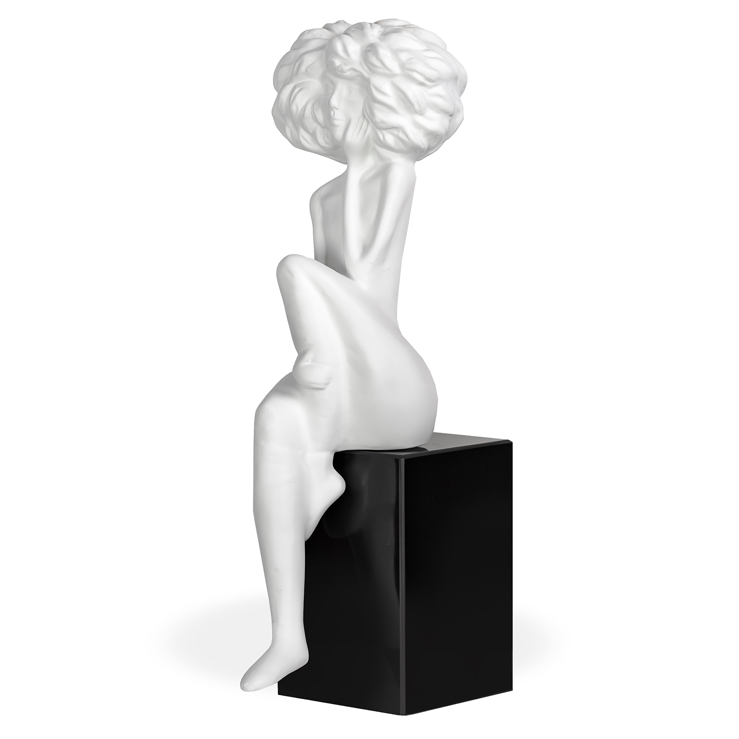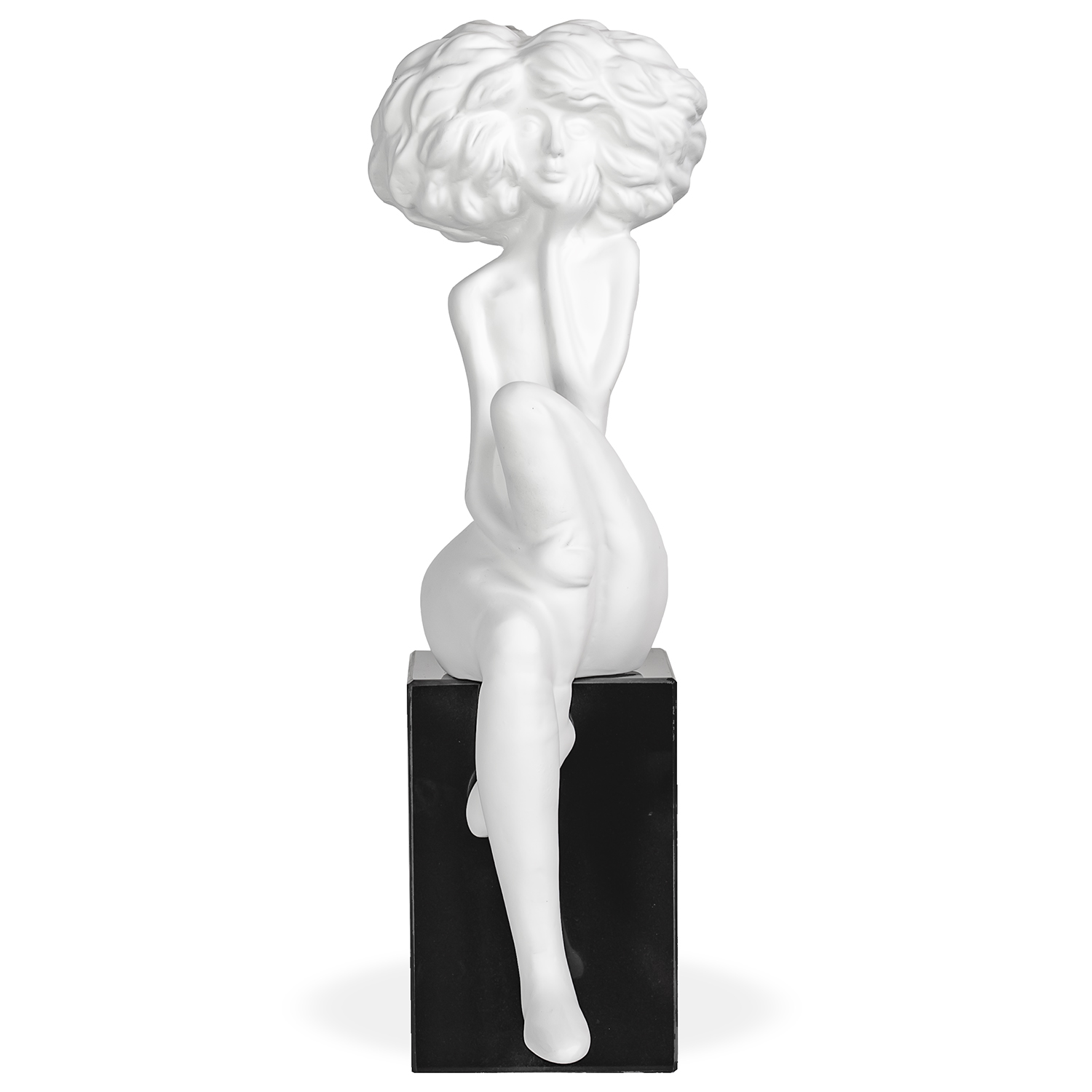[0] => The Mat Lady Sculpture shows a woman sitting in a relaxed, contemplative pose, with her chin in her hand and one knee drawn to her chest. Made by Ambienti Glamour of Italy, this sculpture is available in polyresin with a matte white finish and mounted on a black stone display base.
