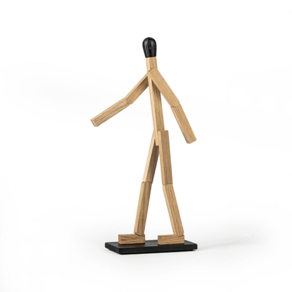 The simplicity of this large Match Man reflects a clean, functional, and balanced way of living. Hand-crafted from natural solid oak, the figure features adjustable arms and legs, along with magnets in the feet to help keep Match Man steady - even when life tries to throw him off balance. Please note: Solid wood should not be exposed to direct heat or sunlight as this will discolor and dry out the wood; the product must be kept away from wood-burning stoves, radiators, etc.