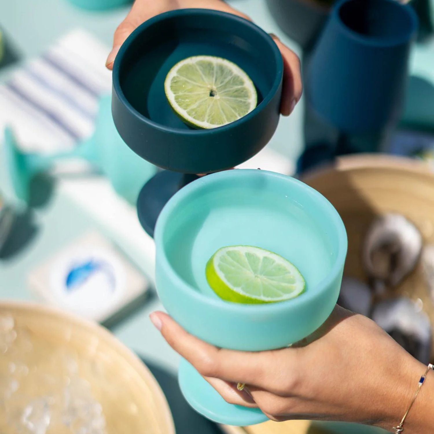 Add a splash of fun to your dining and cocktail experience with the Mecc Silicone Cocktail Glasses, sold as a pair in sophisticated shades of mist blue and dark, inky teal. Designed in Australia from FDA approved food-grade silicone, these unbreakable glasses are lightweight, portable, and outdoor-friendly. They are also safe for hot drinks, dishwasher, and freezer thanks to their ultra-durable construction. A sustainable alternative to single-use drinkware, Mecc is perfect for picnics, poolside, camping, festivals, and a plethora of other entertaining occasions.
