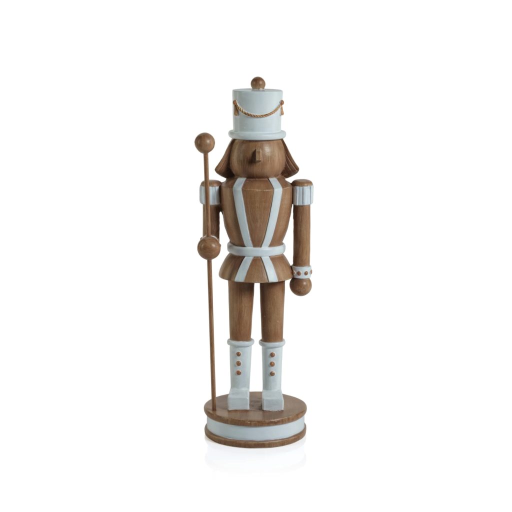 [0] => Add a touch of joy this season with the Medium Nutcracker Figure. Featuring a realistic wood look and white accents, this figure stands at attention holding a staff. Mix and match with the companion nutcrackers to complete your holiday aesthetic.