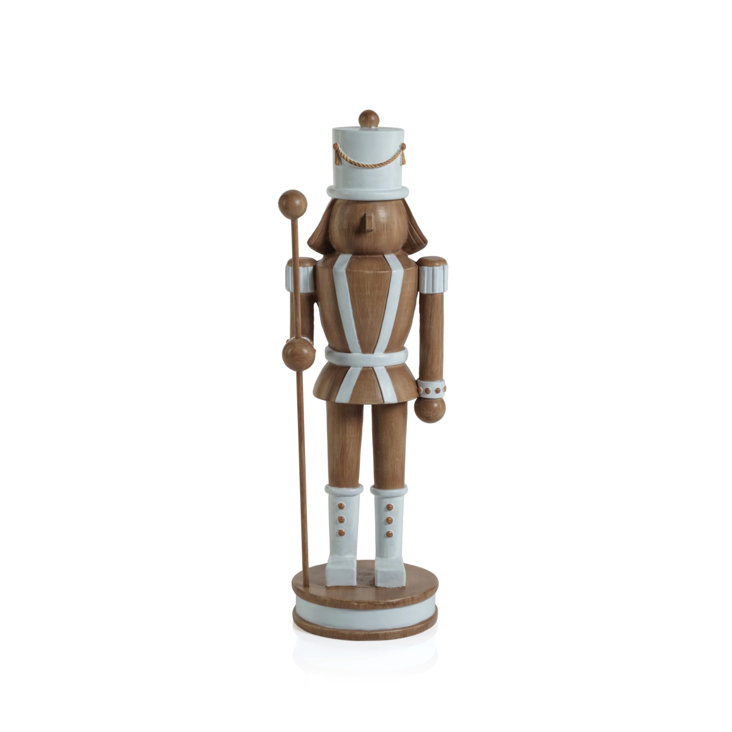 Add a touch of joy this season with the Medium Nutcracker Figure. Featuring a realistic wood look and white accents, this figure stands at attention holding a staff. Mix and match with the companion nutcrackers to complete your holiday aesthetic.