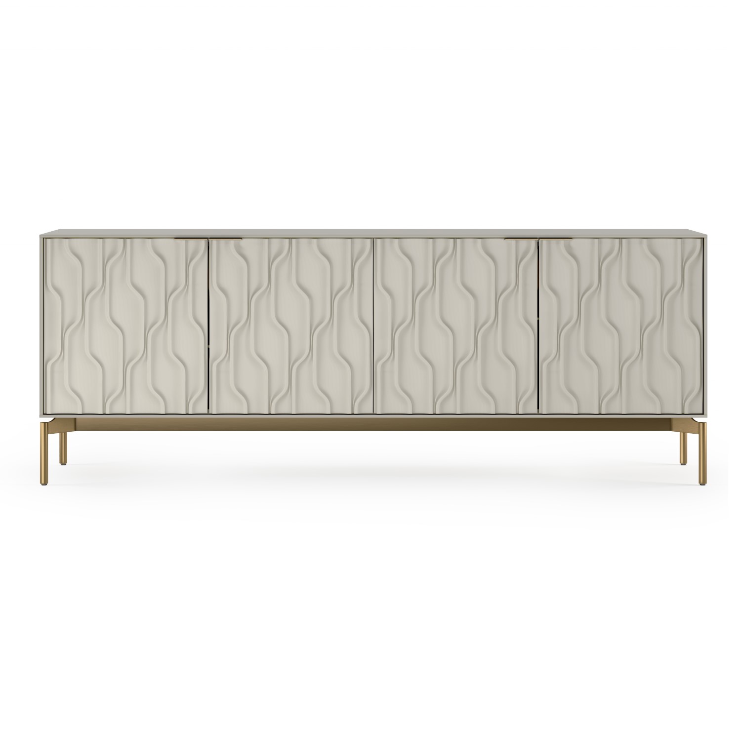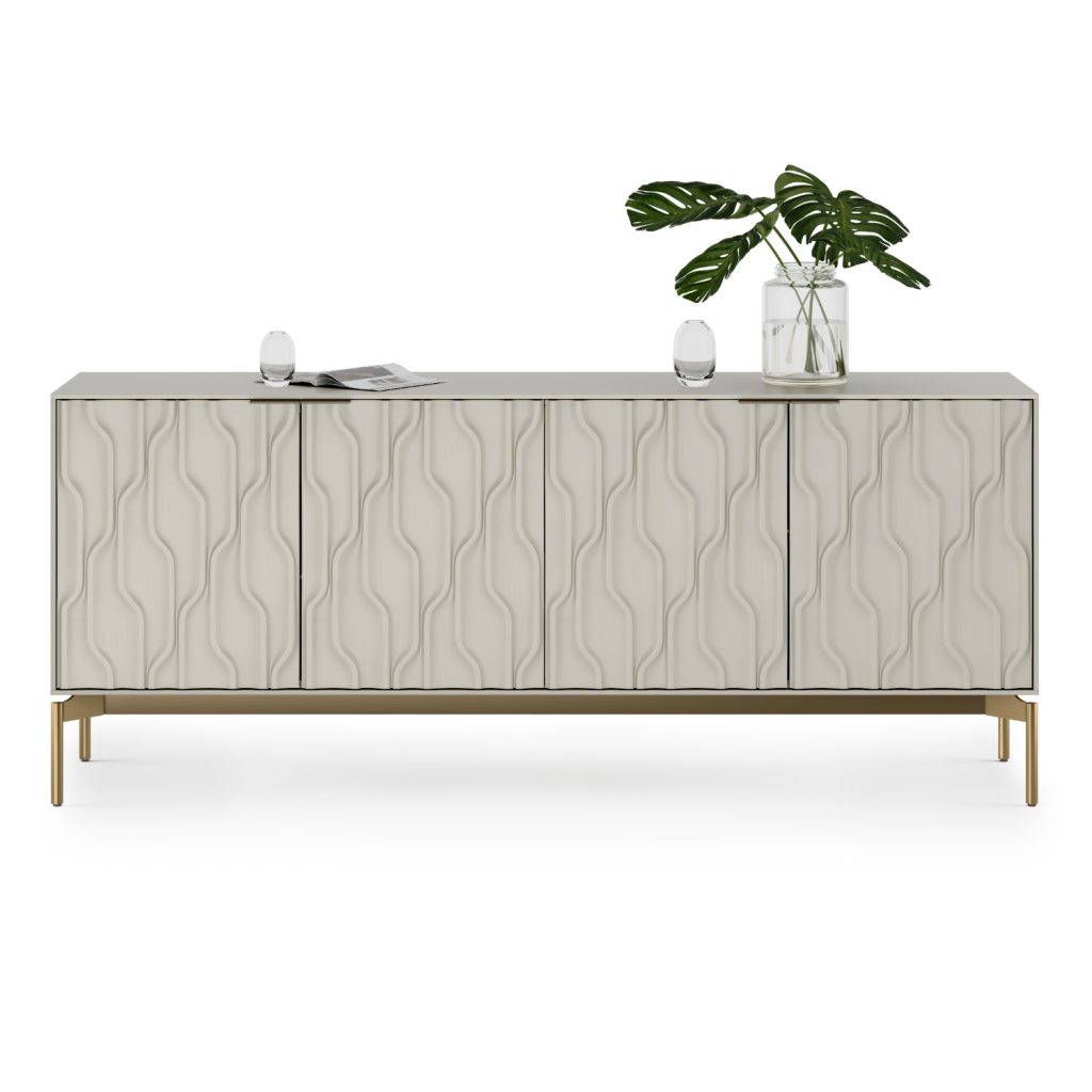 Designed by Jason Guidry for BDI, the Mesa Storage Console merges seamless functionality with an utterly unique modern design. Mesa features a stone finish with brushed brass legs and three soft-close doors carved with a sinuous pattern that instantly catches the eye. Both beautiful and versatile, this storage console comes with two clear tempered-glass shelves and two utility drawers -- all with adjustable positioning -- as well as floor levelers and wire management slots for maximal adaptability. Mesa's drawers have soft, nonslip liners that can be removed for cleaning, allowing for worry-free storage of even fragile items. A marvel of form and function, Mesa can be used in your living room or entryway as a credenza, or in your dining room as a sideboard or bar.
