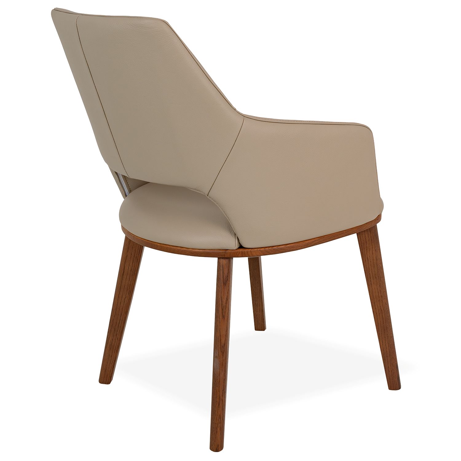 [0] => Timeless yet modern, the Myla Dining Chair has a stylish profile with rounded corners and a cutout in the lower back. The deep bucket seat provides a supportive, enveloping feel, while the angled backrest facilitates relaxation at the table. Myla is available with a walnut base and light mocha top-grain Italian leather upholstery for premium comfort and longevity.
